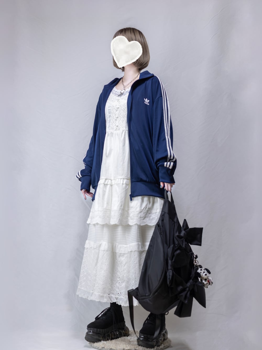 スポーティーなトラックジャケットに甘めな白のレースワンピースを合わせるのがお気に入りです☺︎