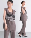 シーンに合わせてアレンジが可能な【ベスト&ビスチェ&スリットパンツ3ピースセット】に 大きめリボンがデコラティブな【タックスタンドカラーオーガンジーシアーボウタイブラウス】を合わせてドレスアップ! シアーなボウタイブラウスできちんと感を保ちながら、ハレの日にふさわしい華やかさを。