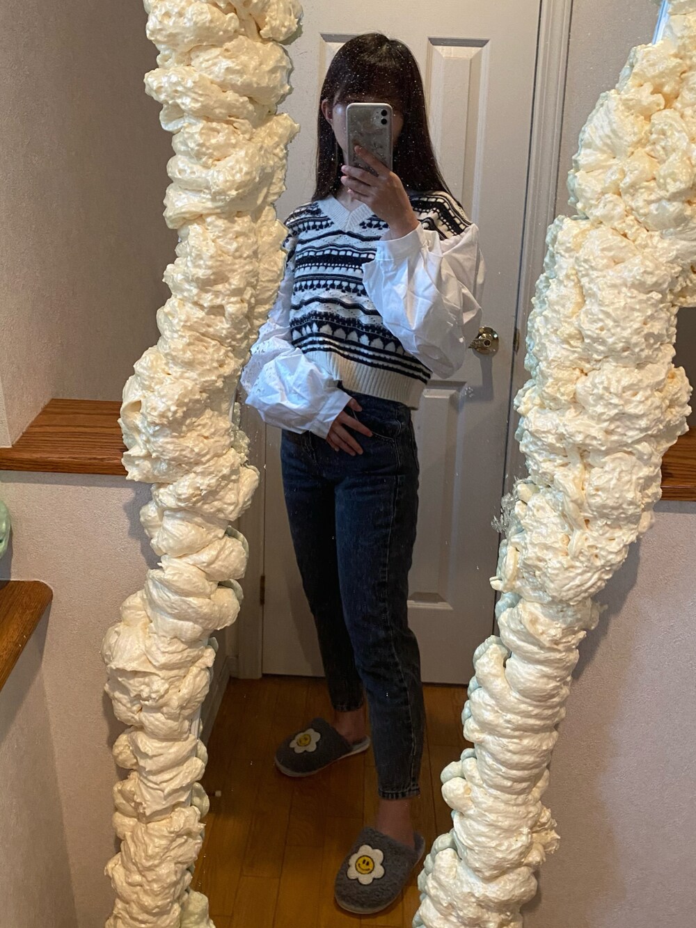 雨で肌寒いのでニット×ブラウス(袖)のトップスを合わせました🍃🔆☺️ 袖にボリュームがあるから可愛い💕 下は少しわかりづらいですが、薄い黒のデニムを履いてます👖