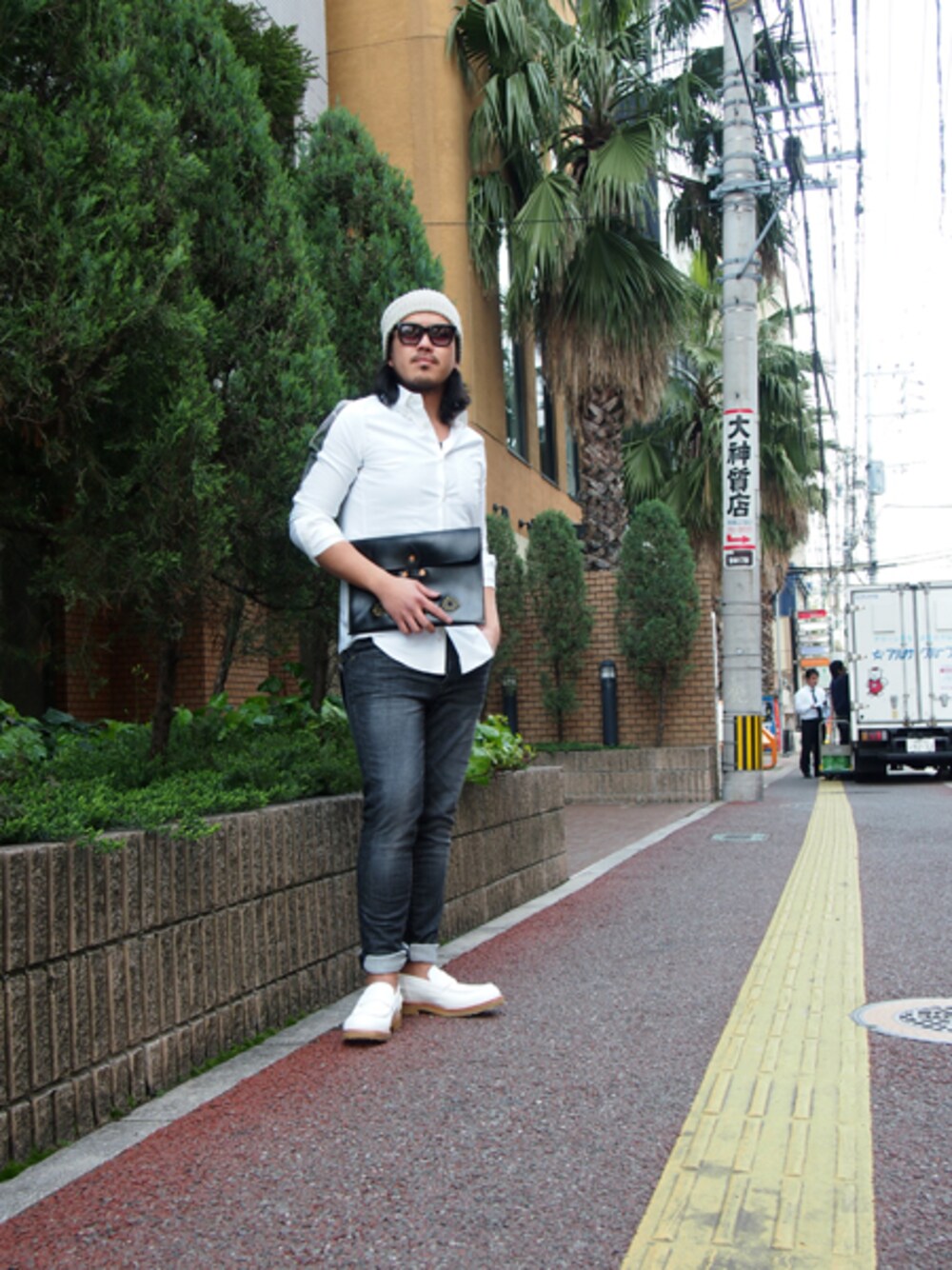 SHIRT:1 piu 1 uguale 3 39,000yen(+TAX) BOTTOMS:1 piu 1 uguale 3 37,000yen(+TAX) LOAFER:AKM 68,000yen(+TAX) BAG:HTC BLACK 33,000yen(+TAX)