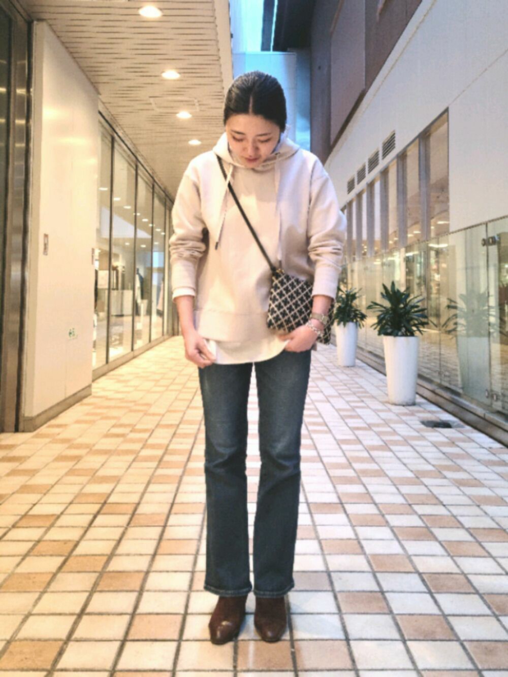 本日も元気に出勤して参りました。朝は-8℃という極寒でかなり冷え込んでいます。皆様も体調などお気をつけ下さいね☺️ 今日は以前にもコーディネートで使用した、パーカーをデニムに合わせて着てみました🎵春先いいですね☺️