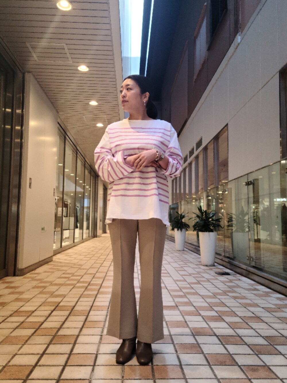 春らしいカラーのボーダーTシャツメインのコーデです。ゆったりしたサイズも可愛いです😊