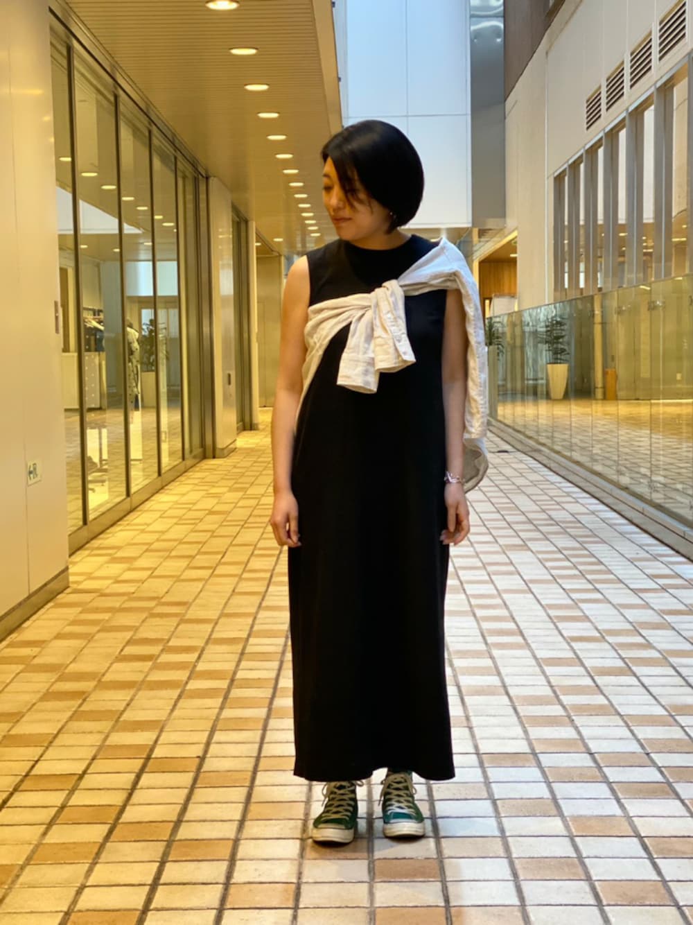 綺麗なシルエットのワンピースです😊 グリーンのCONVERSEと合わせてカジュアルダウンしたコーディネートです😃