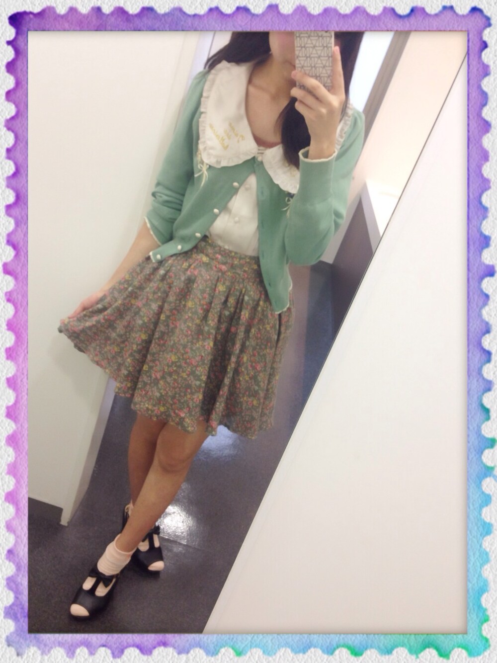 ブラック系のパンプス、グリーン系のカーディガン/ボレロ、ホワイト系のTシャツ/カットソーを着用したレディースの春コーディネートの1枚目の写真