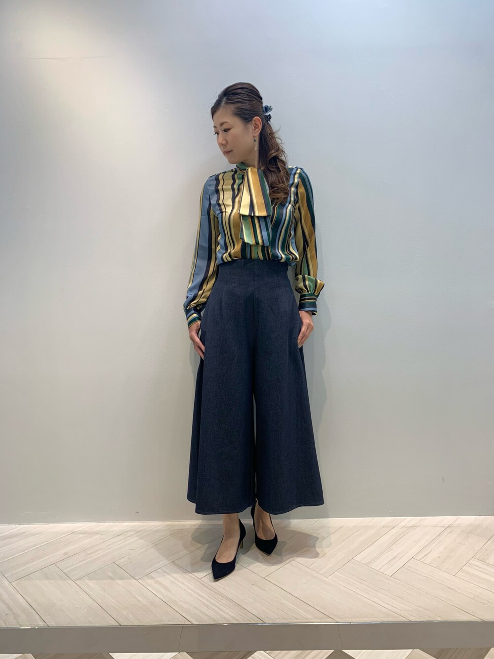 マットサテンでレトロな風合いのストライプブラウス♪ 透け感もなく1枚着はもちろんジャケットやカーディガンと合わせても存在感抜群です⭐︎ デニム調ワイドパンツと合わせてキレイめカジュアルコーデ♫ ブラウス10-12-01-516 0サイズ/ブルー パンツ 30-12-09-621 1サイズ/ネイビー