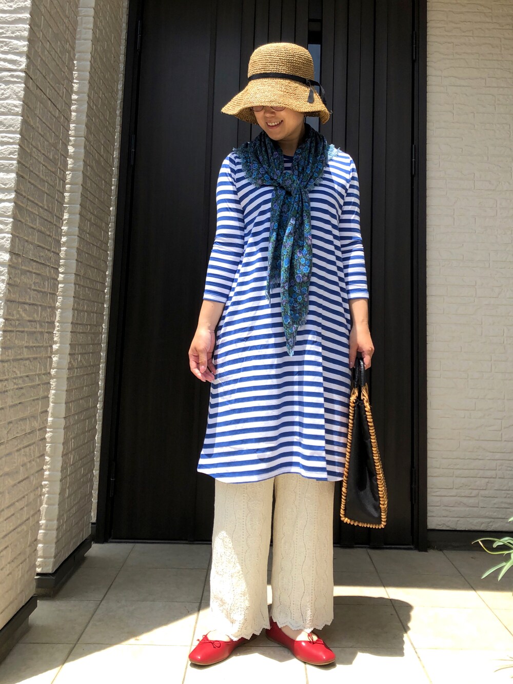 kamokamosanのワンピース「カレッジ コットンワンピース[七分袖/ボーダー]」を使ったコーディネート