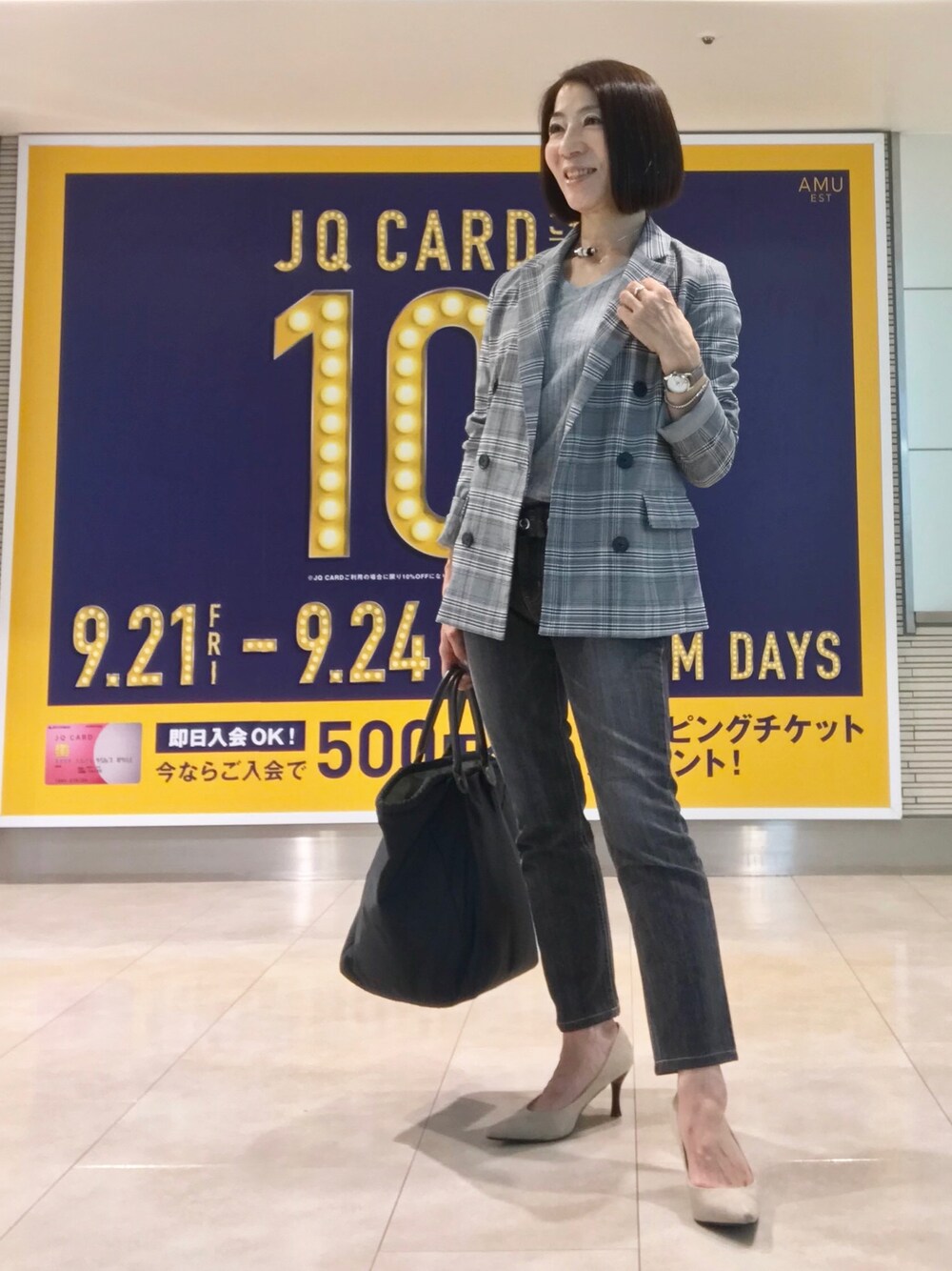 グレンチェックダブルボタンジャケットを安室ちゃんの様にダボっと着こなしたいと思いサイズアップしましたが似合わず。ジャストサイズSを購入。 安定のデニムと合わせました。