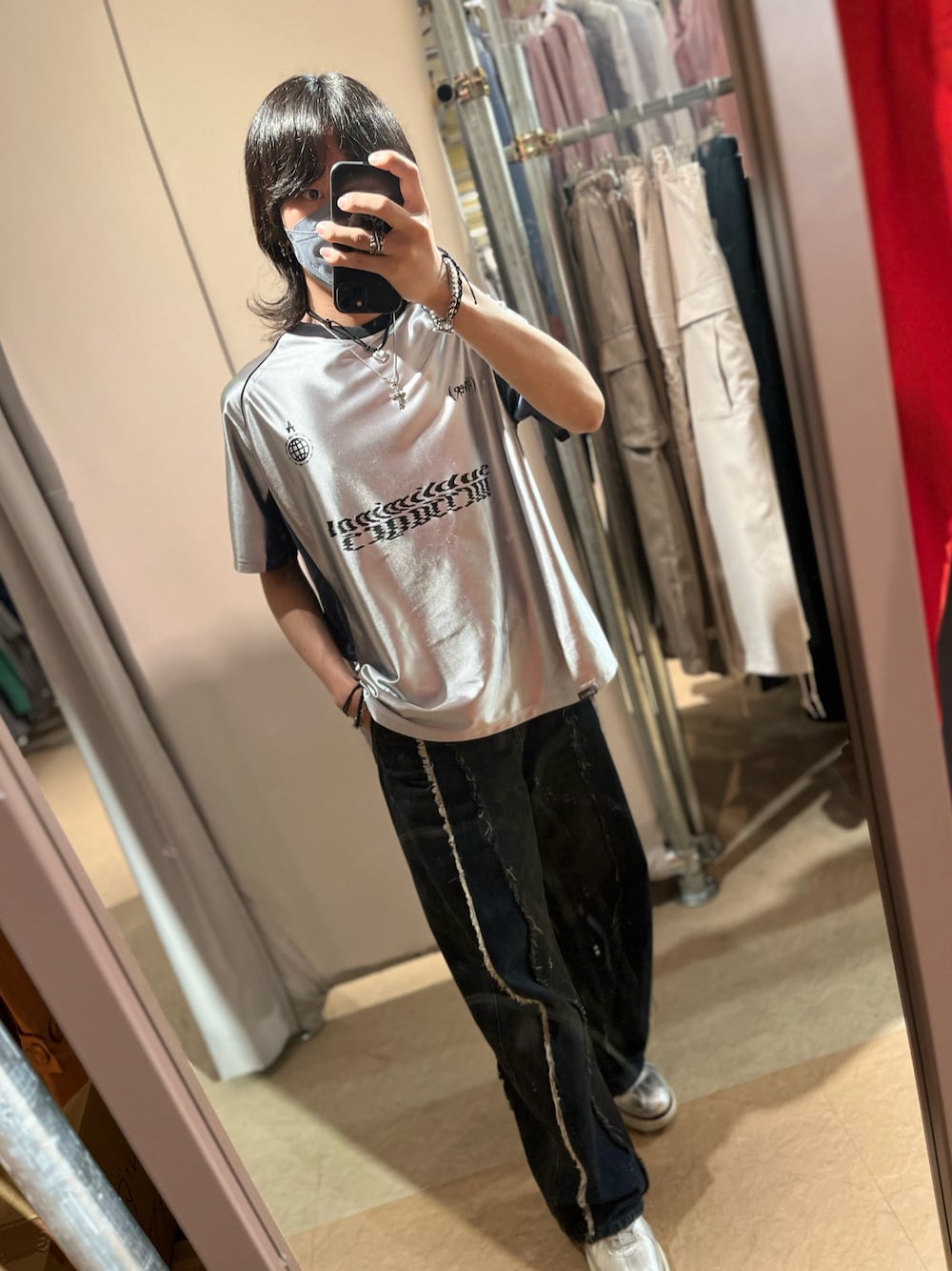 シルバーのゲームシャツにシルバーのスニーカー合わせ✨ ゲームシャツは今季の流行り♪ シルバーのアイテムも今季の流行り♪