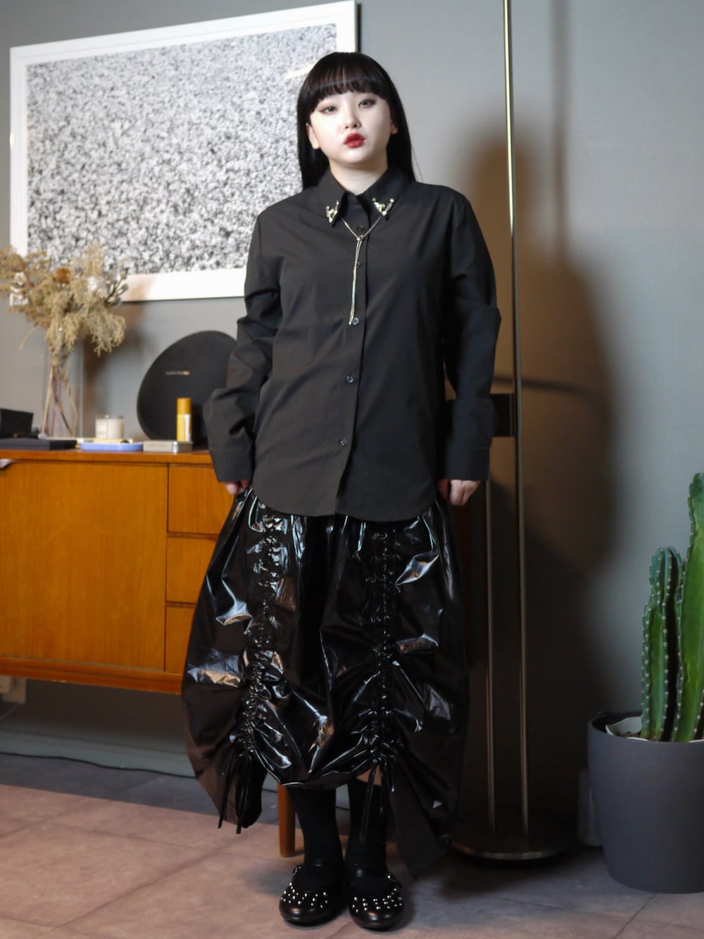ビジューがお洒落を引き立てるシャツに 着るだけで主役になるメタリックスカートを合わせたモードなスタイル。