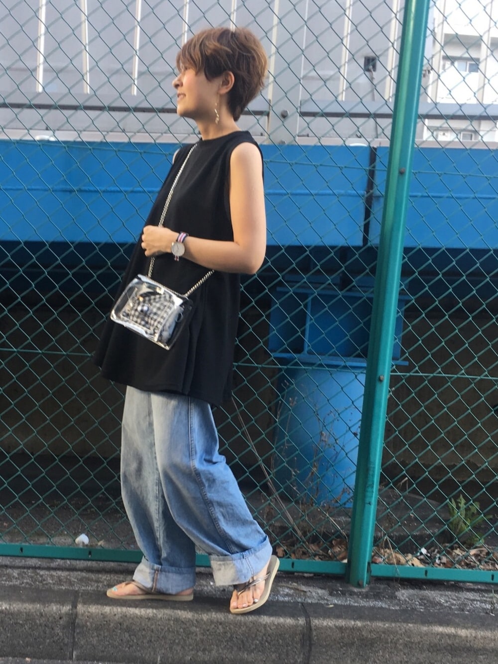 るみっぺのTシャツ/カットソー「エンボス加工ノースリーブAラインチュニック」を使ったコーディネート