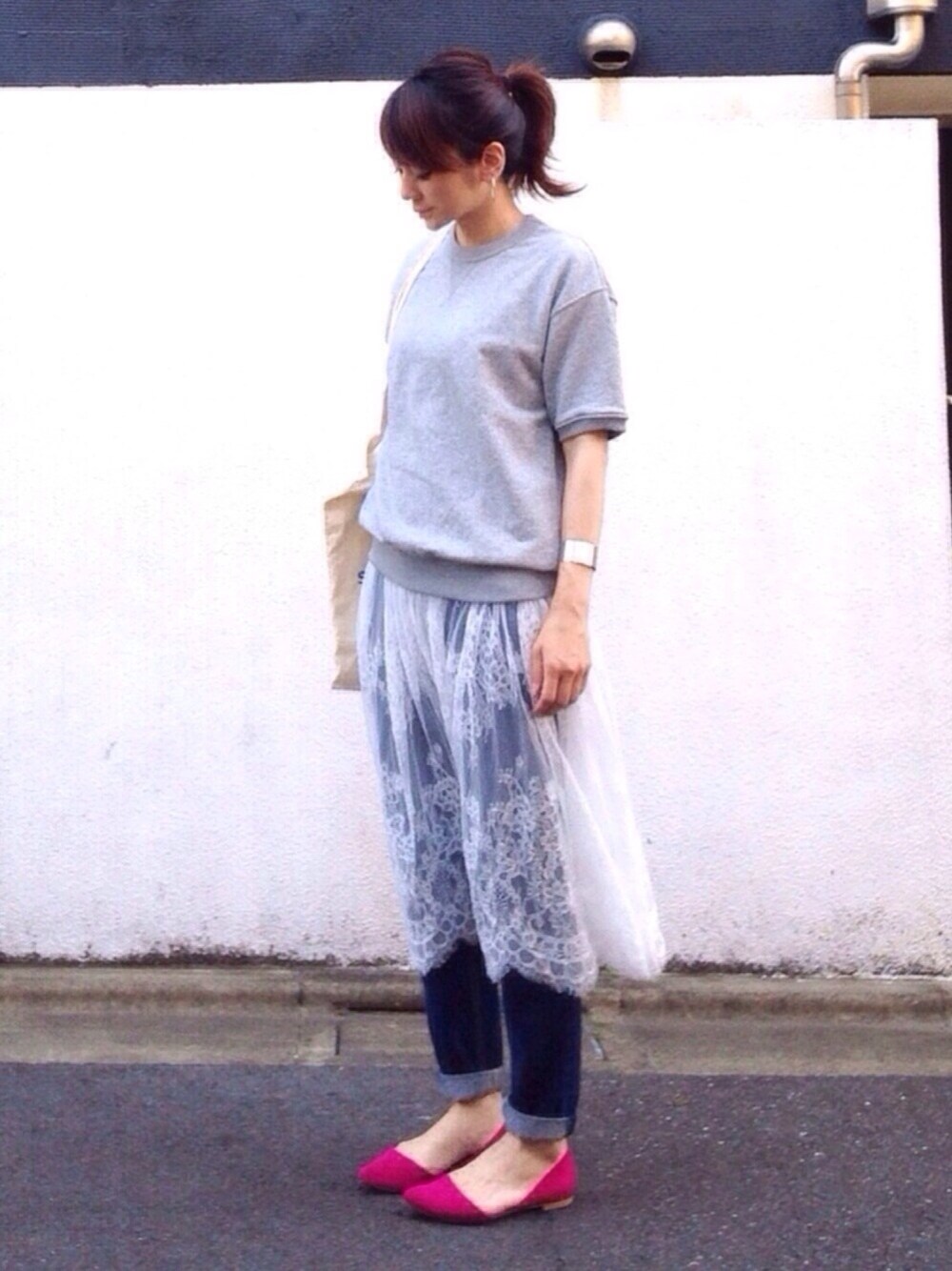 やってみたかった レースワンピースのレイヤードスタイル🙈💕💕 GU メンズ の グレースウェットはSサイズでちょうど良いユルさ🙆🏻レースとの相性抜群👍🏻 これで990円はお値段以上です😇