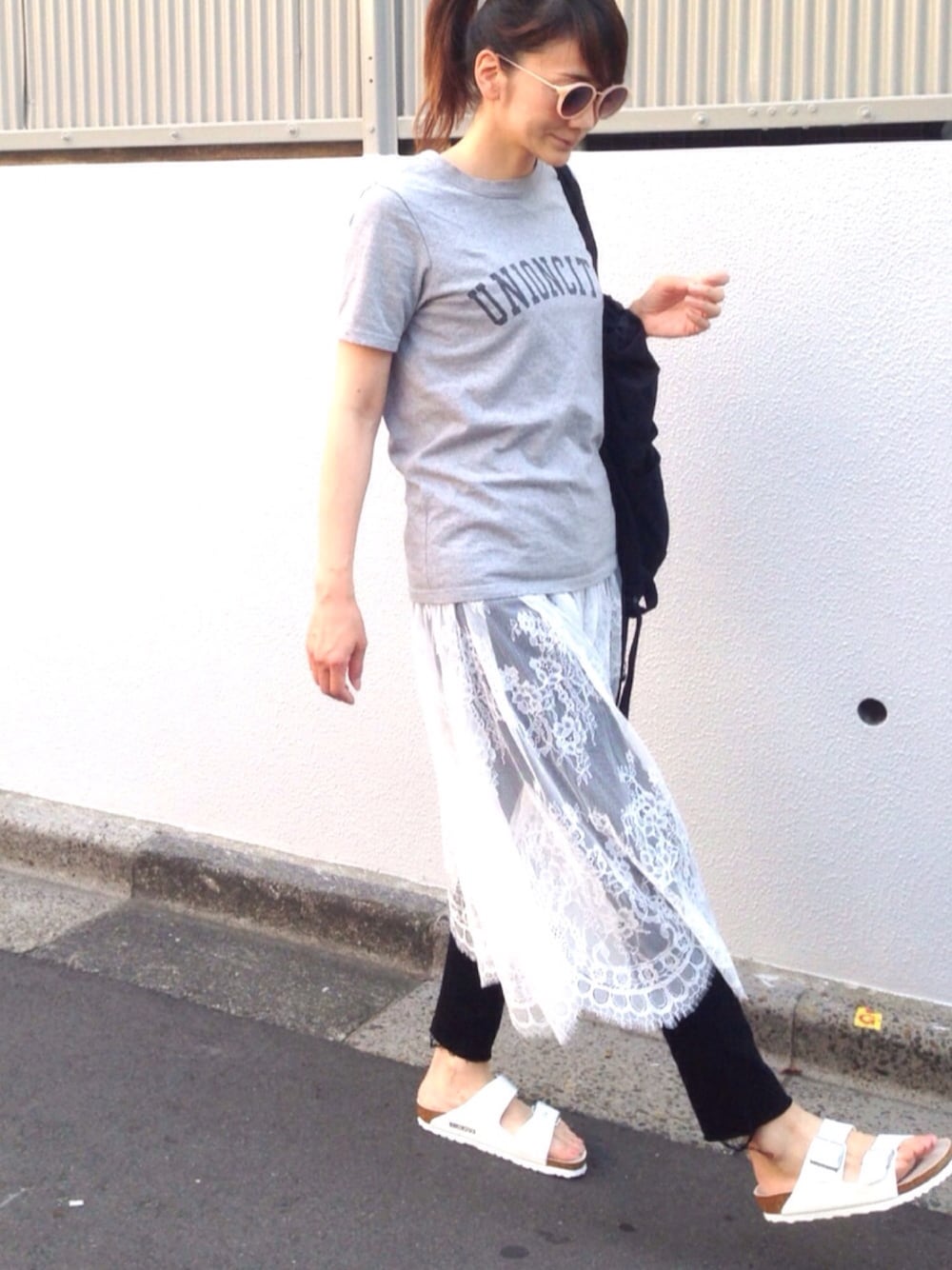 レースワンピース × ビルケン🙈💕💕 夏は洋服がシンプルになってくるので、ピンクフレームのサングラスで色味をプラス😎 ビルケン アリゾナ 白 は、想像以上にどんなコーデにも合わせ易い優れものです🙆🏻