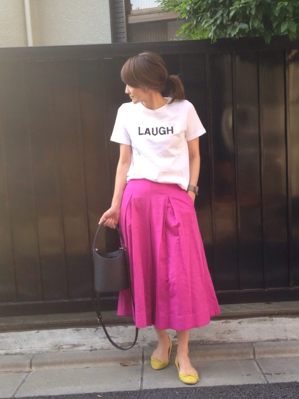 LAUGH😆💕 milaのガウチョパンツはスカートに見えるところがお気に入り🙆🏻 ガウチョが濃いピンクで靴を何色にするか迷ったけど、黄色が意外にしっくり❤️ 色には色で の法則🙌🏻