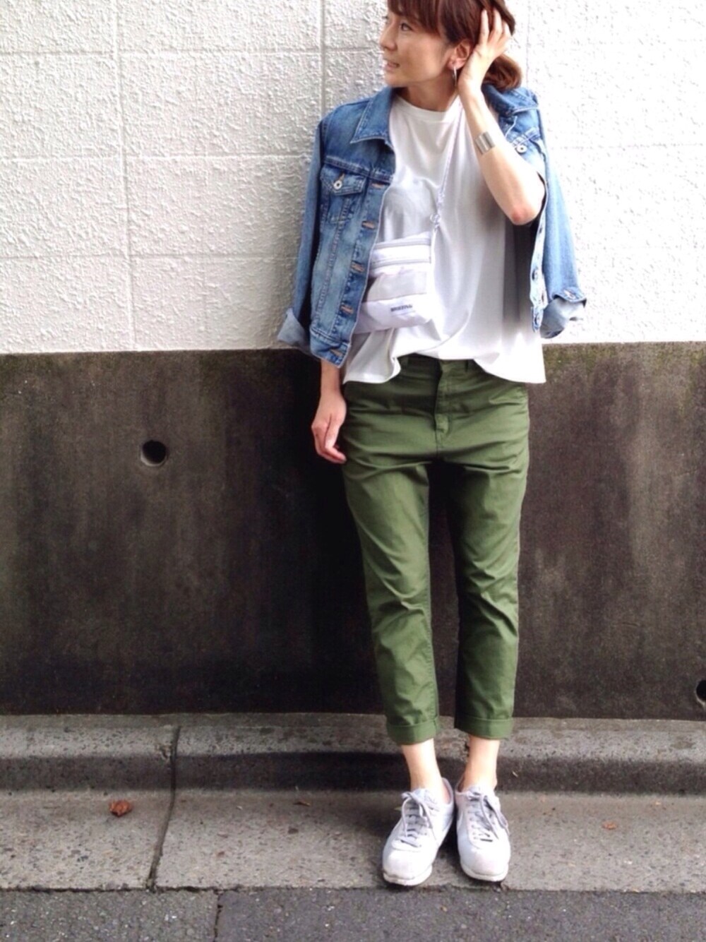 カーキ × ホワイト😇 爽やかコーデ。サコッシュバッグがアクセサリー代わり。🙈💕💕