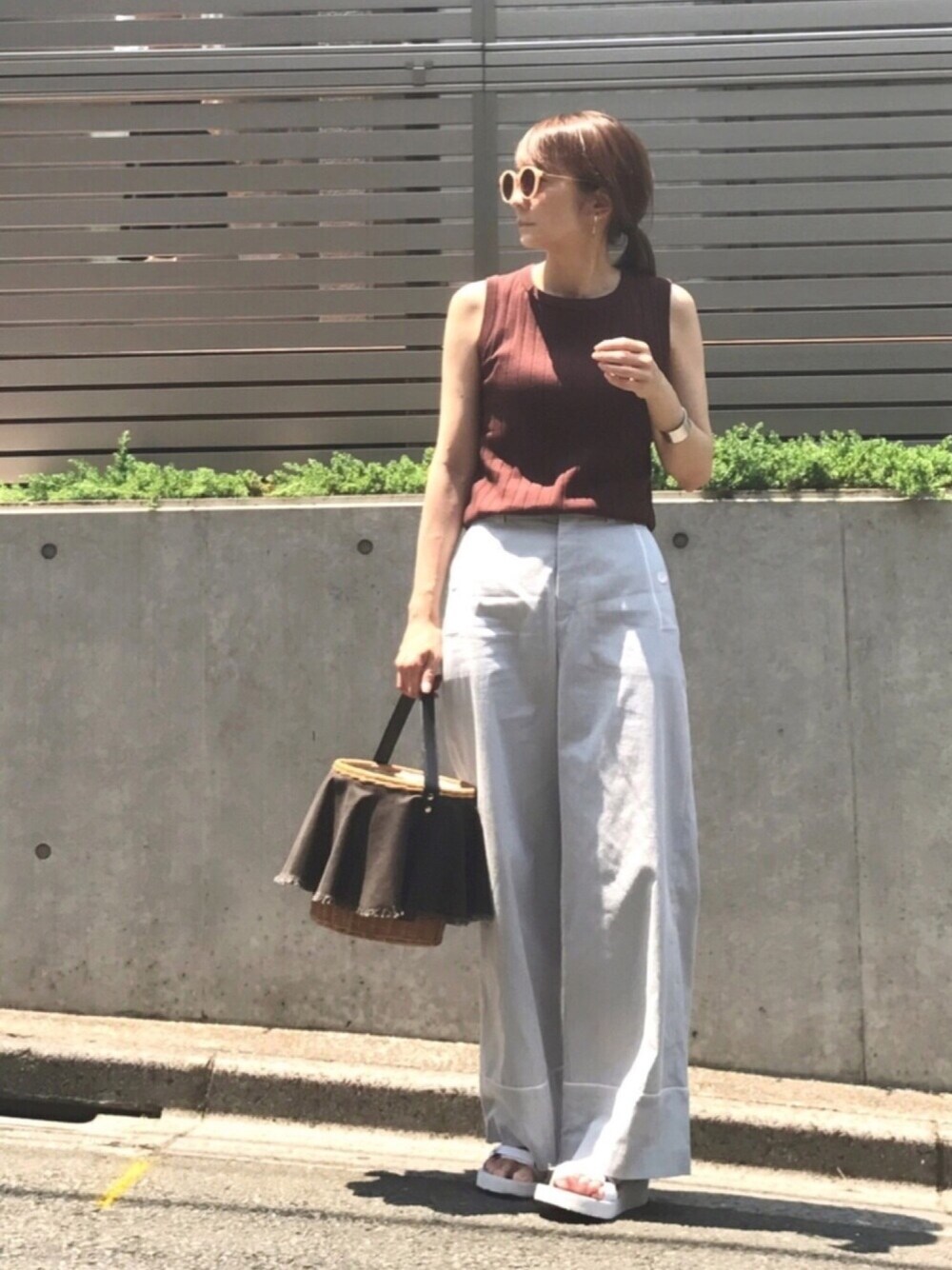 ブラウン × 水色 毎日暑いですね💦💦 マリン風ワイドパンツなら、気分だけでも爽やかに🐬🏄♀️🐚 この撮影の後、肩が焼けてました🤣
