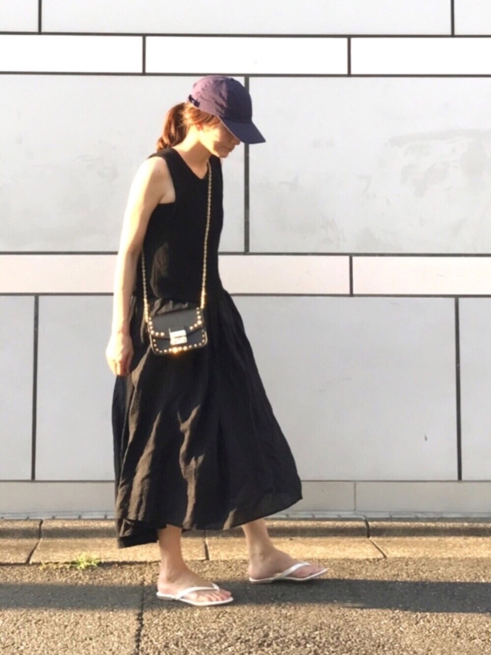 エレガントに広がるフレアスカートを、キャップとビーサンでカジュアルに😇 足元は黒と迷って、白ビーサンにしました🙋🏻‼️