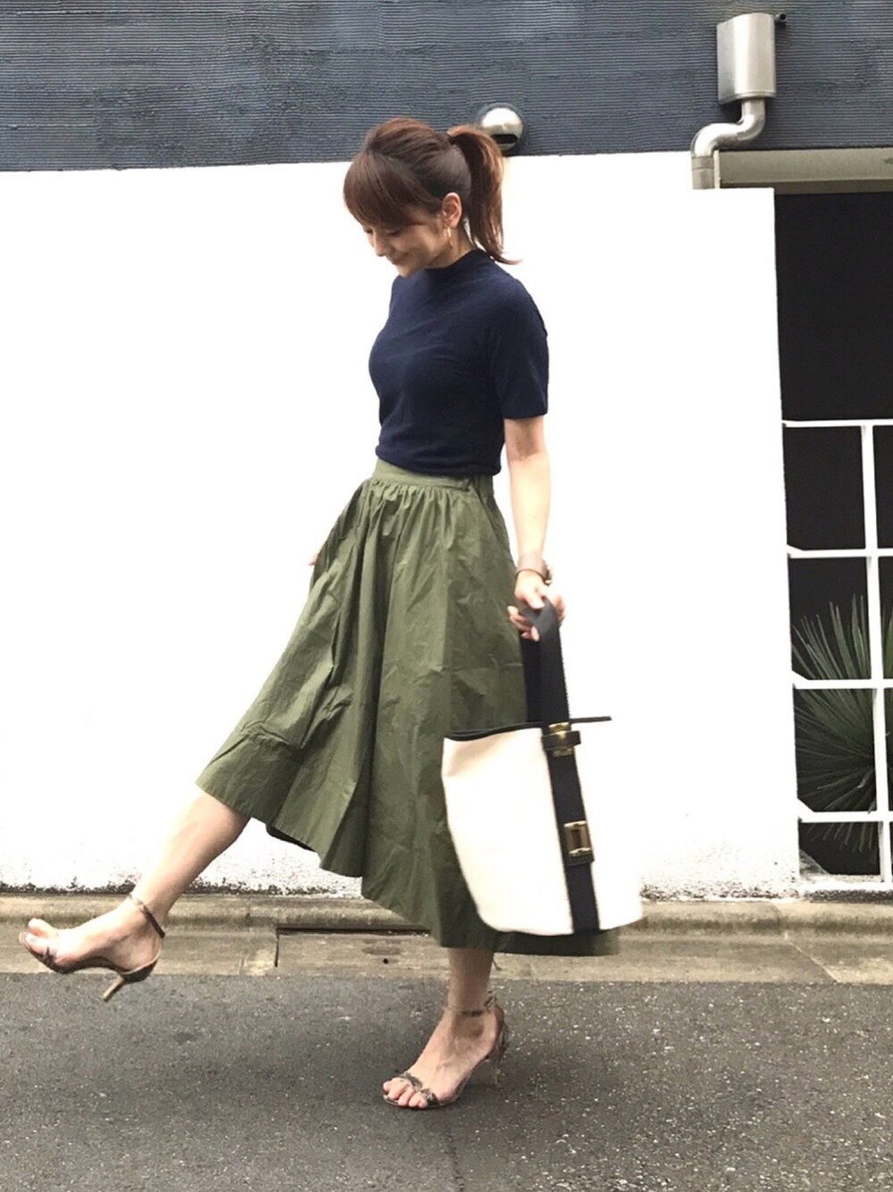 ネイビー × カーキ TシャツをハイネックTシャツに替えるだけで、ちょっぴり秋っぽコーデ😇 二の腕を隠せる袖丈が嬉しい❤️秋ぽくても生地は薄手なので涼しいです🙆🏻
