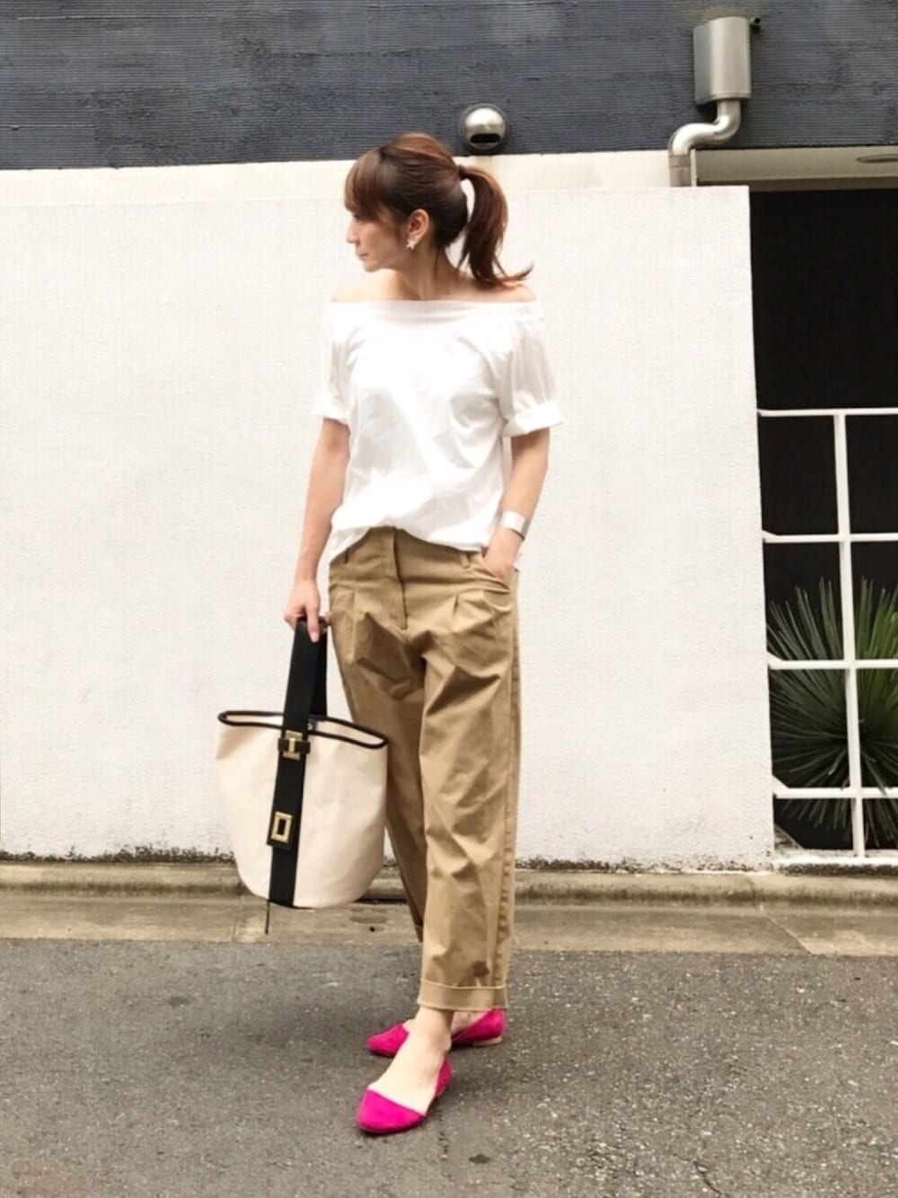 ワイドチノパン × ピンク😇 この組み合わせ、大好物💕💕 furryrateの白トップス、今日はオフショルダーにしてみました🙌🏻 生地に光沢があるので程よく上品🙆🏻