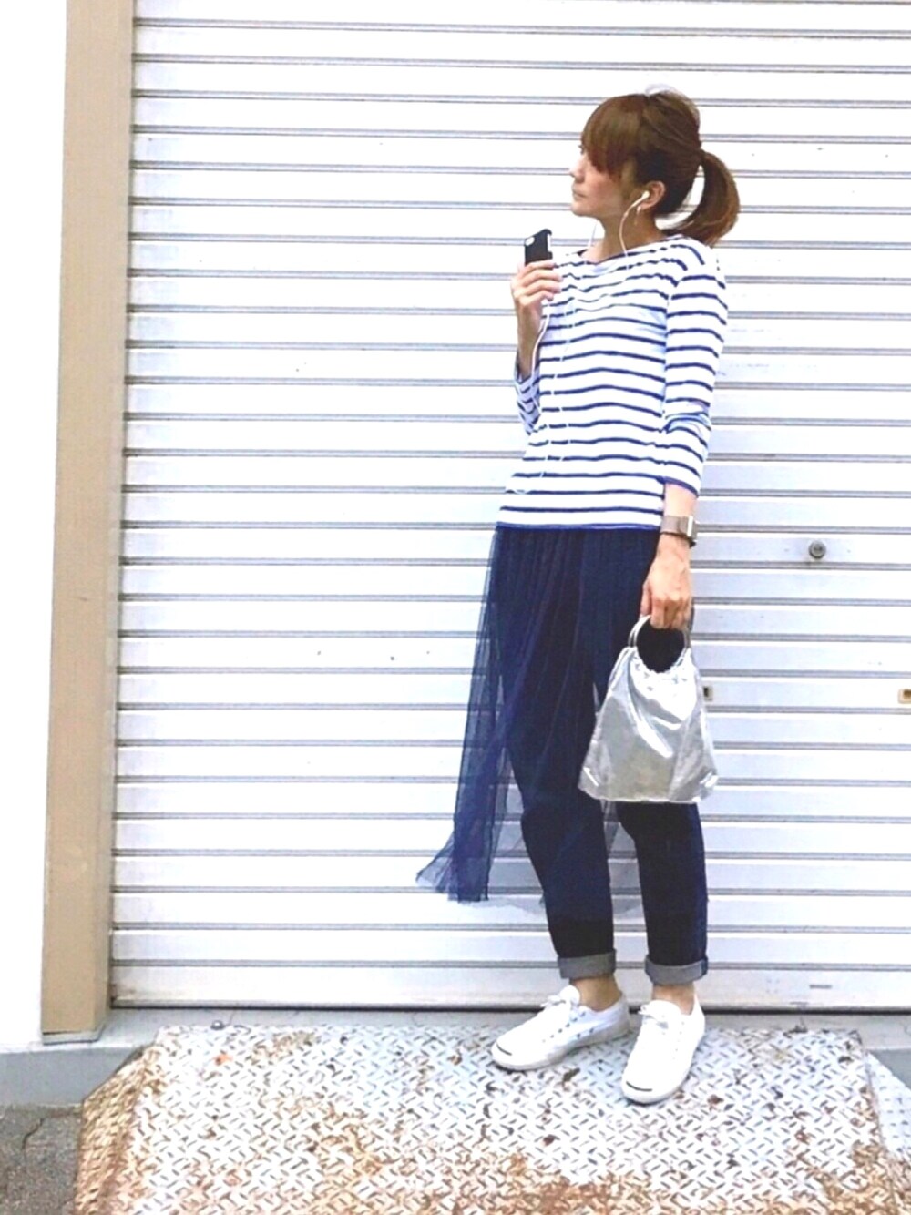 チュールスカート × ボーダー チュールスカートのレイヤードを限りなくヘルシーにまとめてみました😆💕💕 シルバーの小さめバッグをポイントに🙋🏻