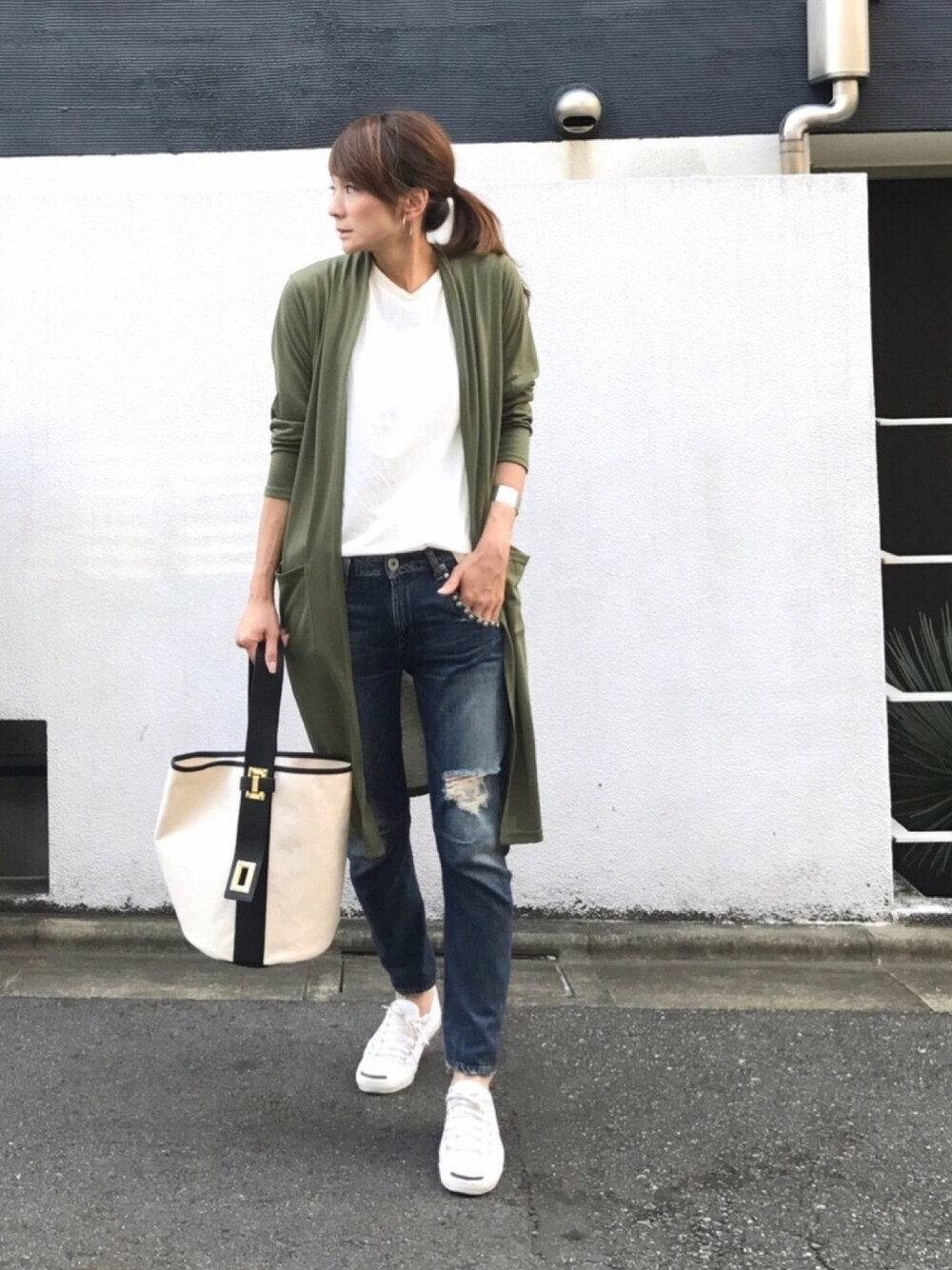カーキ × 白 × デニム 間違いないやつ😇 白多めだと爽やかです💁🏻 カーキカーディガンならミリタリージャケットを合わせるより、上品で女らしくなります❣️