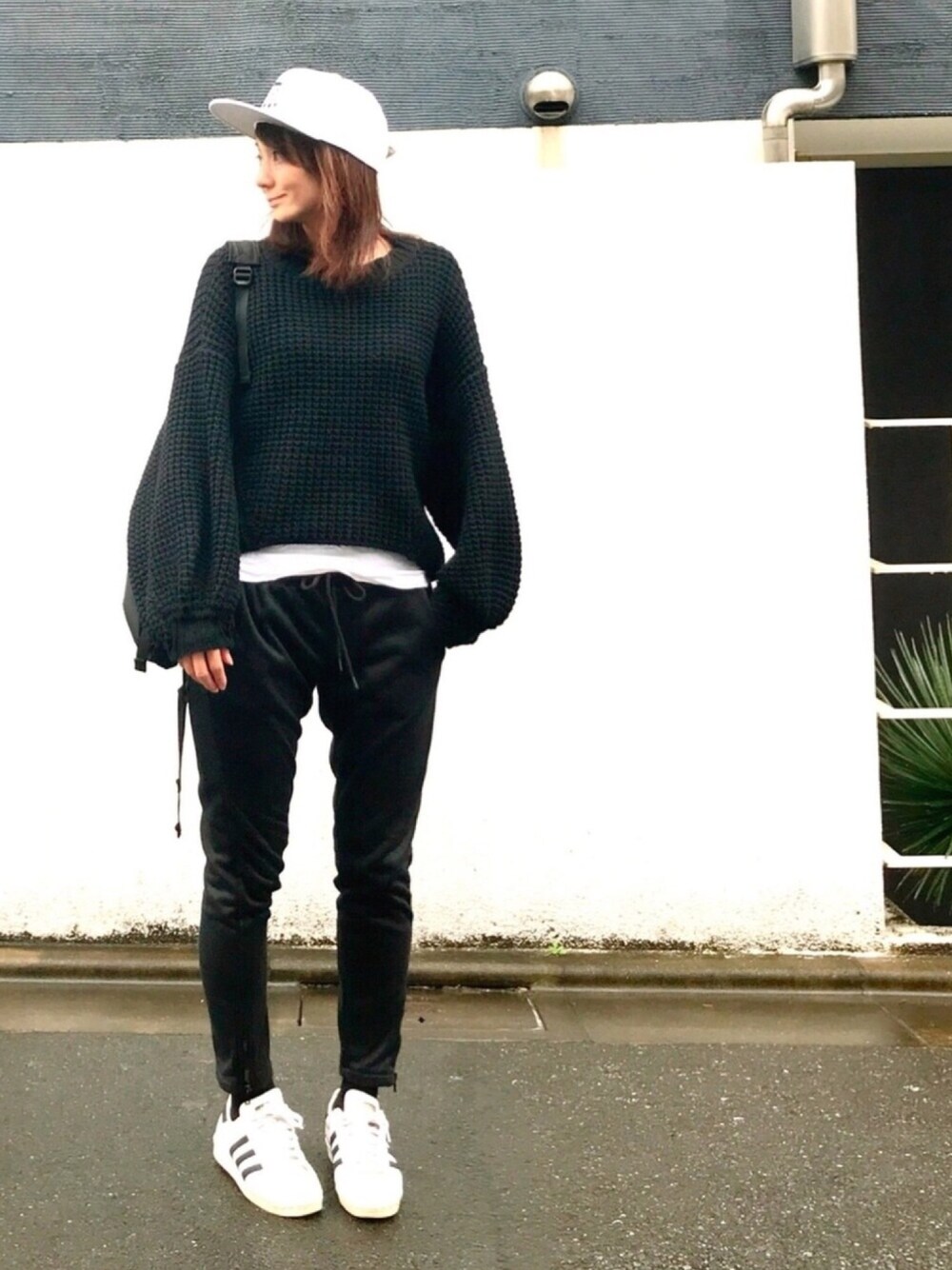 モノトーンスポーティ 白キャップは、暗くなりがちなモノトーンコーデを華やかにしてくれます🙋🏻‼️ ボリューム袖ニットが女子っぽ😆💕💕 ボトムスもスウェットで、とことんスポーティな感じにしてみました🙌🏻