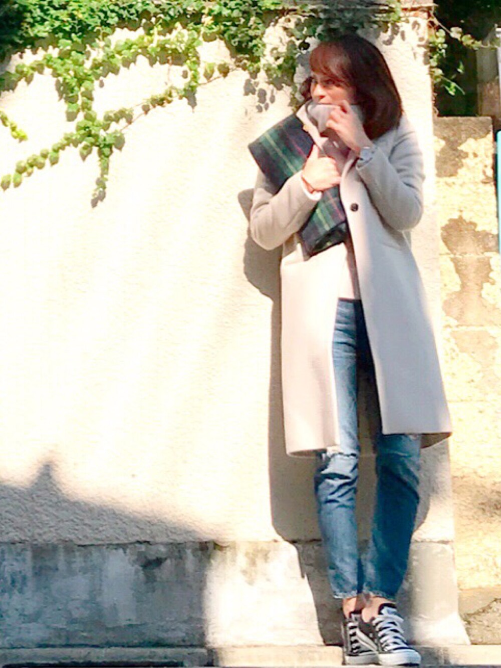 白のチェスターコート 敢えてダメージデニムとスニーカーで合わせてみました🙋🏻‼️ 細身ですっきり綺麗なシルエットなので、白なのに太って見えないのが嬉しい😆💕💕