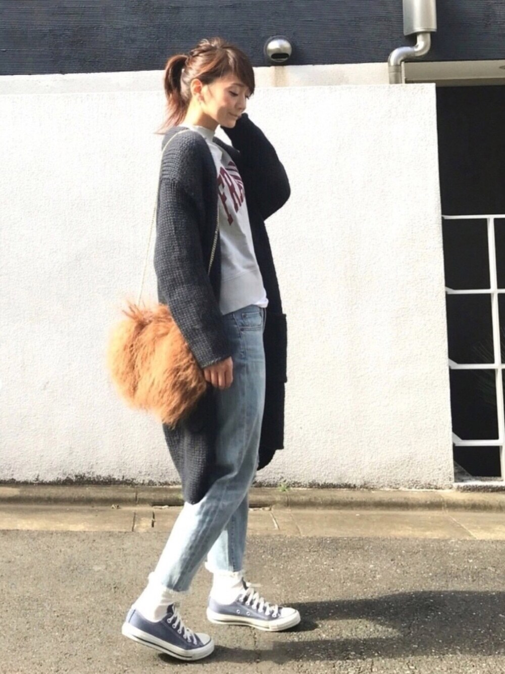グレーのロゴスウェット😆💕💕 ずっと欲しくて探してたやつ。DOUBLE NAMEで発見👀✨✨✨ 私にしては珍しく黒を使わない、淡めのワントーンにしてみました🙋🏻 プチプラなブラウンのファーバッグもポイントに❤️