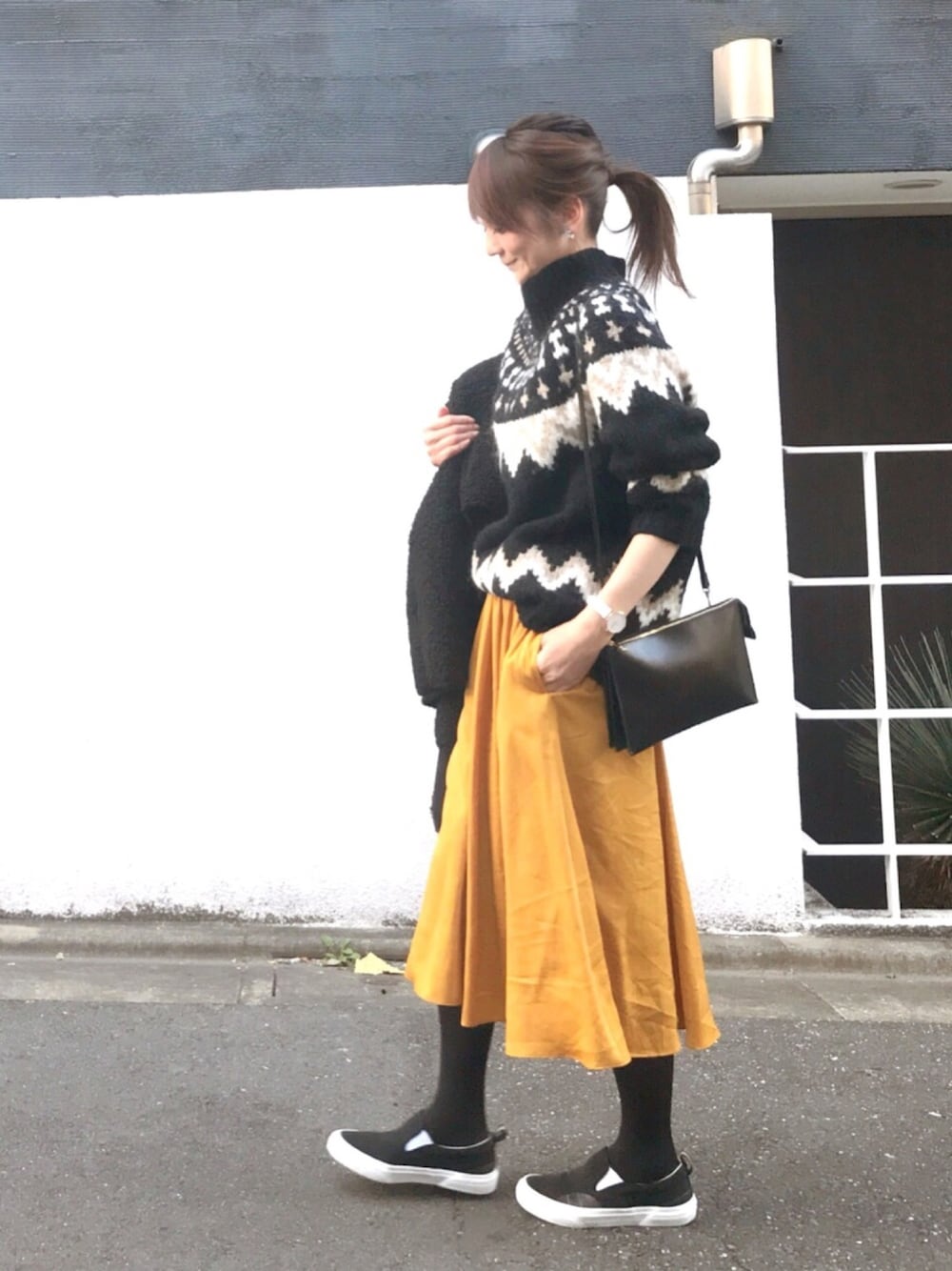 久しぶりにノルディック柄 コーデがマンネリ気味になってきたら、色物を追加してみる🙆🏻 美シルエットのフレアスカートは黄色というよりマスタードみたいな色で、大人ぽく履けますよ😆💕💕 スカートとセットのグレーニットも凄く可愛い形で、かなりお買い得なセットアップでおススメです🙌🏻