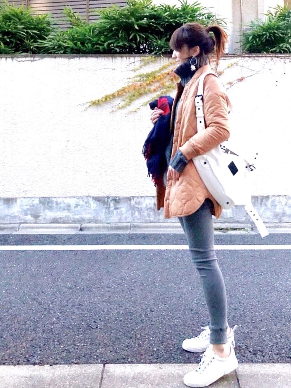 キルティングコート × レギンス 小物を白にして爽やかコーデに😆💕💕 タートルネックが高いから、重心が上にきてスタイルアップ🙆🏻