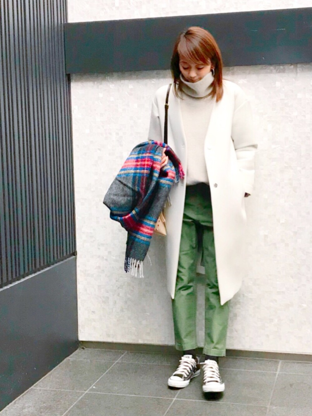 LUMIEのブランケット「ツイードミル 大判厚手ストール 限定別注カラー」を使ったコーディネート