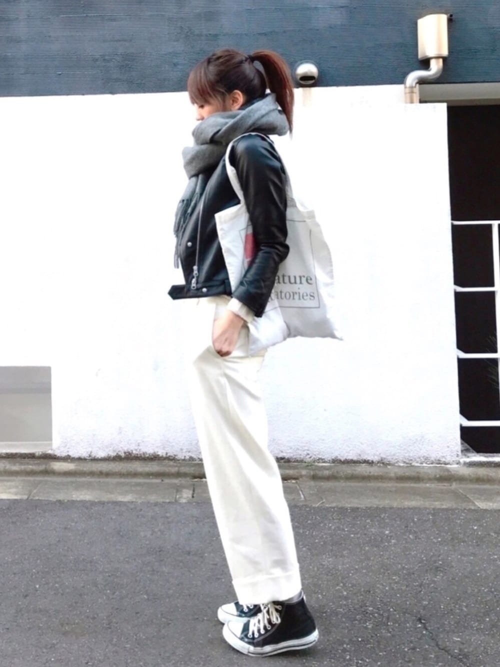 白多めのモノトーンカジュアル😆💕💕 ライダースでも、ボトムスがゆったりした白パンツだとハードにならずほっこりします🙆🏻 ぐるぐる巻きしてるグレーマフラーは、モノトーンの差し色にちょうど良くてお気に入り❤️SALEでGET💪🏻 1/26 と 1/27 は 神フェス12 巻物祭 是非マフラーやストールを巻いて参加して下さい❣️私も参加予定です‼︎