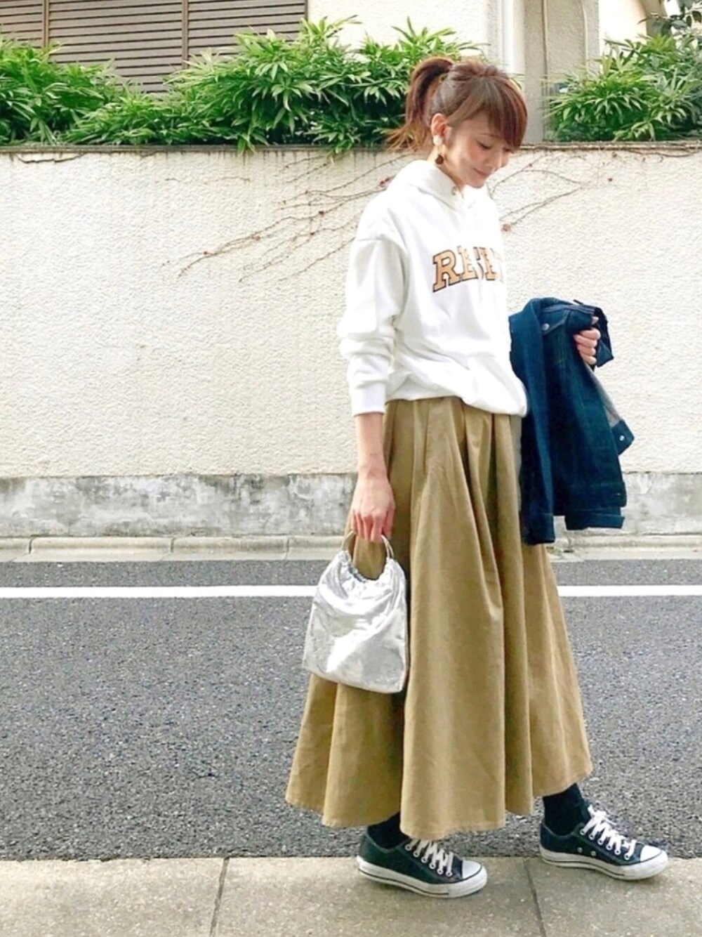 パーカー × チノスカート パーカーのロゴの黄色と、メタルバックで春気分🌸☘️☘️ このパーカー、生地が凄い柔らかくて肌触りが良くて、しかも 2149円 だなんて驚き👀⁉️