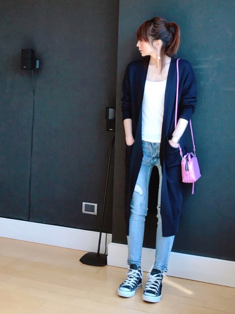 スキニーデニム × ロングカーディガン ウォッシュが効いてハードな印象のスキニーデニムには、華奢なキャミソールとピンクバッグで女子っぽ😆💕💕 OVoVO のスキニーデニムは、柔らかいストレッチだから気持ちよく履けます🙆🏻♀️