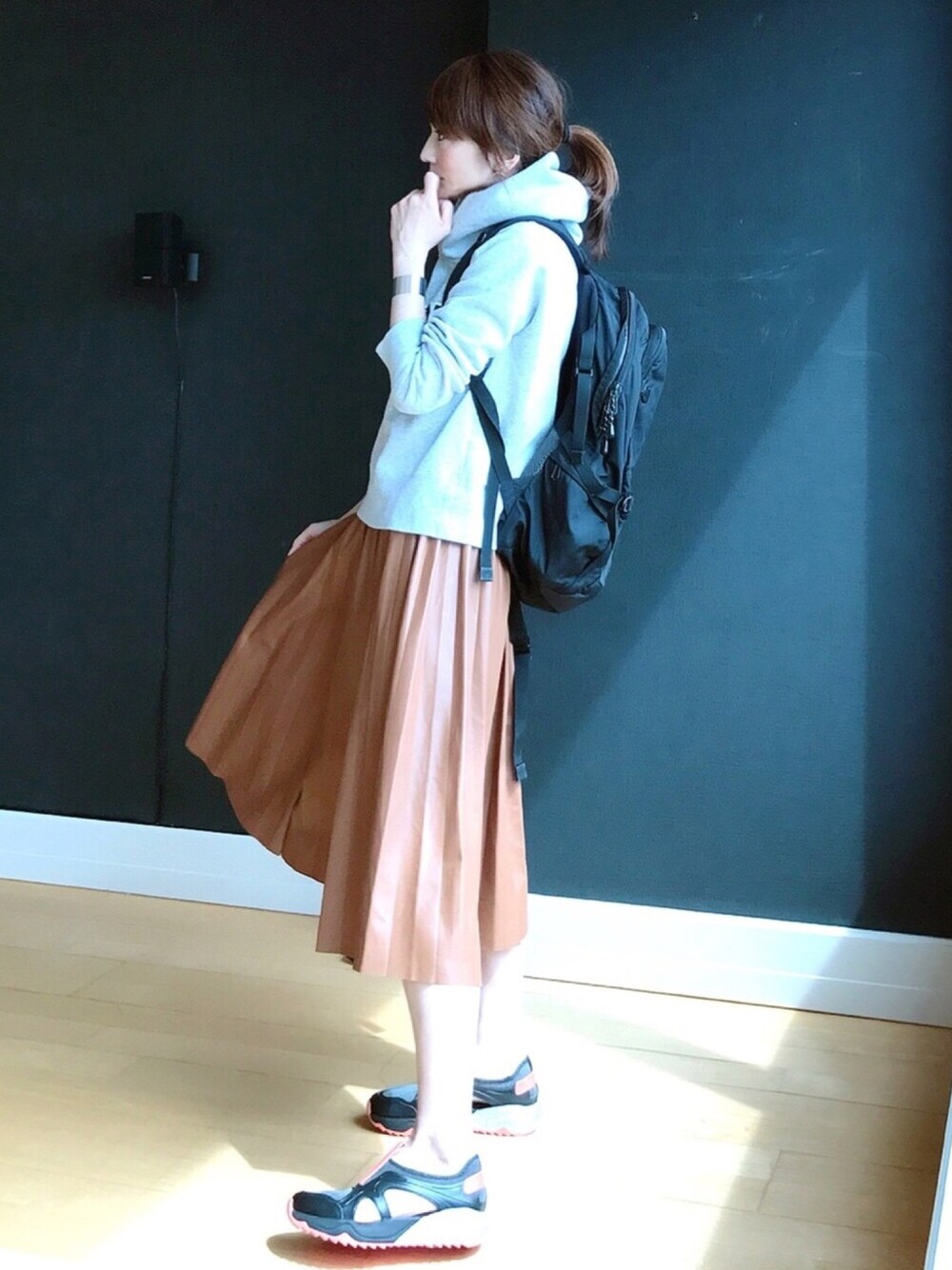 プリーツスカート × スポーティ プリーツスカートには、がっつりなスポーティが意外にもしっくり😊💕💕