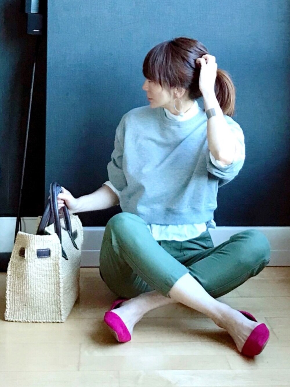 グレー × カーキ × ピンク なんか好きな組み合わせ😌💕💕 OVoVO のスウェットは、シャツをレイヤードして見えるから一枚で様になります🙆🏻♀️