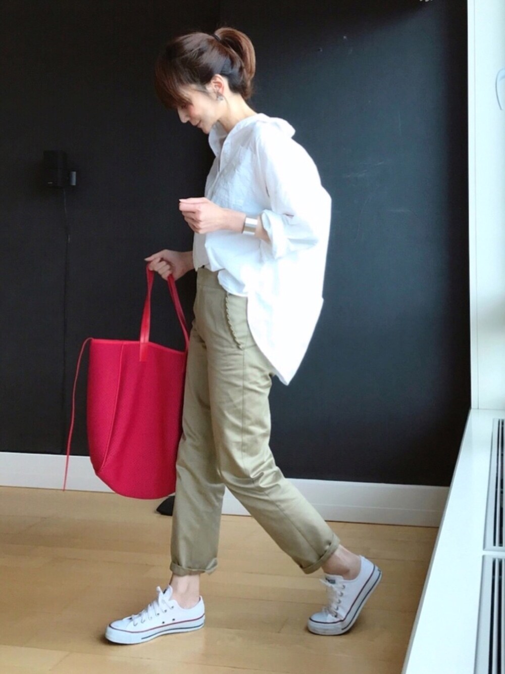白シャツ × チノパン シンプルコーデには、赤のトートバッグをポイントに❤️❤️❤️ 白シャツは、襟を抜いてフンワリ😊