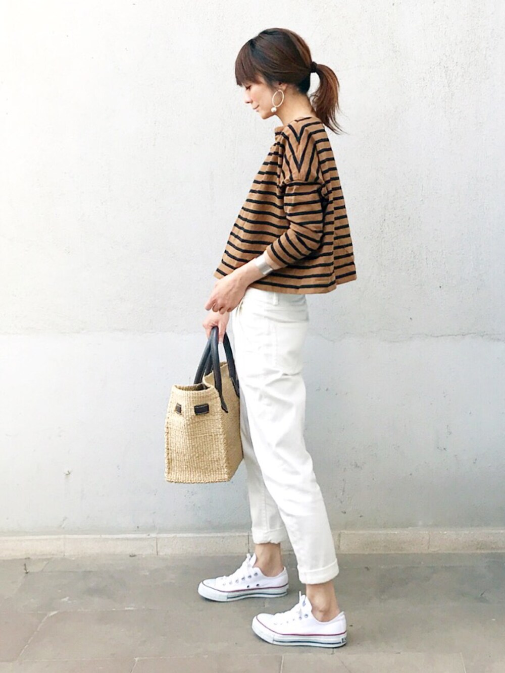 白 × ブラウン トップスのAラインが抜群にキュートだから、それだけでコーデのポイントになります😆💕💕 後はシンプルでいいので楽チンです🙆🏻♀️