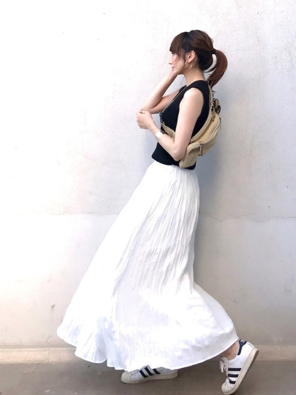 モノトーン × ベージュ 一点ベージュが入るだけでコーデが柔らかくなります🙆🏻♀️ マキシスカートはIラインを強調すると、スタイル良く見えてオススメです😃💕💕