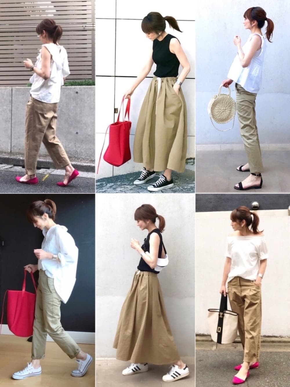 チノコーデまとめ チノベージュには、白か黒が鉄板ですよね😆💕💕 ちょとだけ赤やピンクを差しても可愛いです🙆🏻