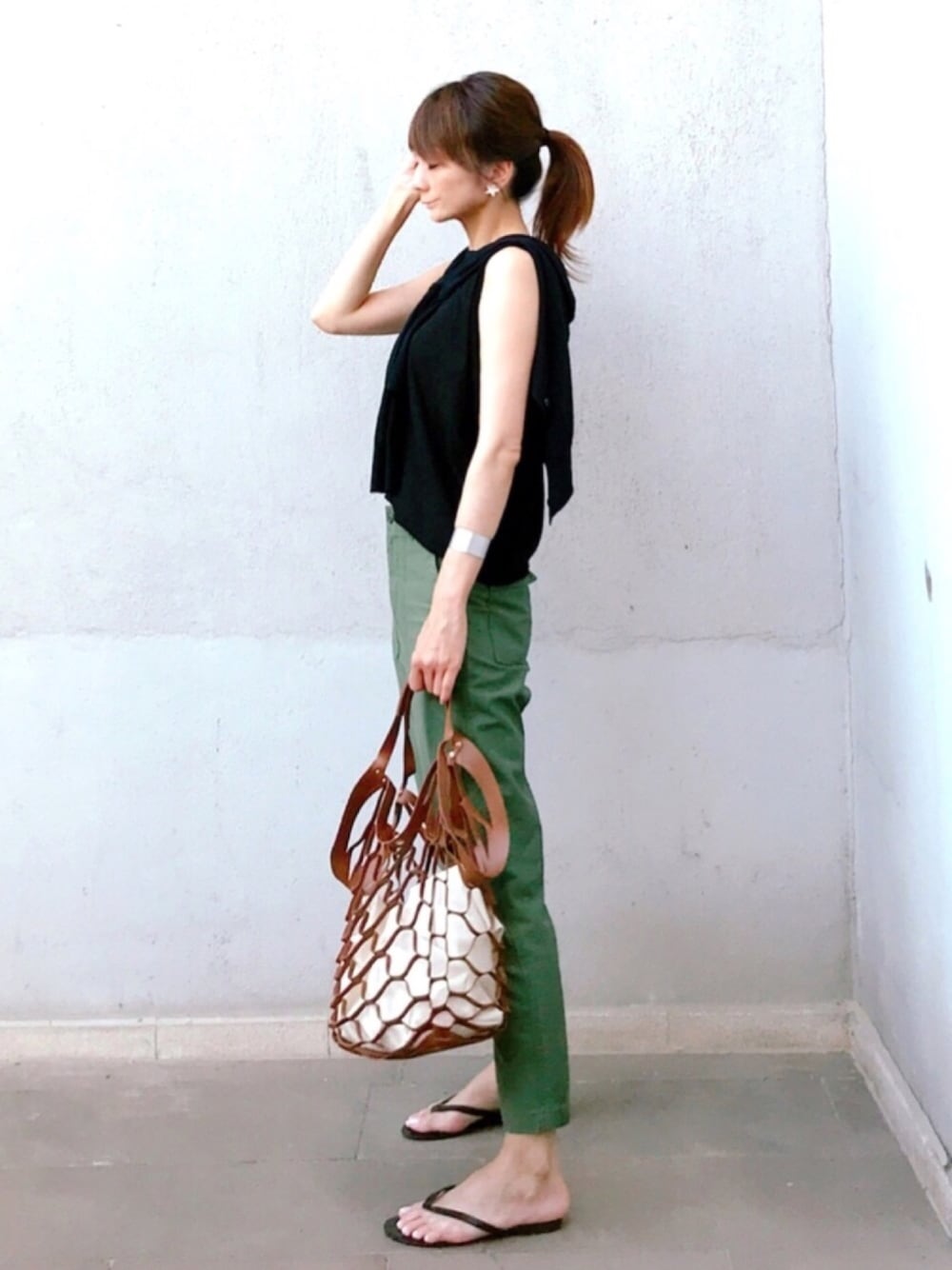 安定のカーキ × 黒 シンプルコーデなので、敢えてカバンはブラウンにしてみました😆💕💕 メッシュバッグは涼しげで目を引きますよね🙆🏻♀️