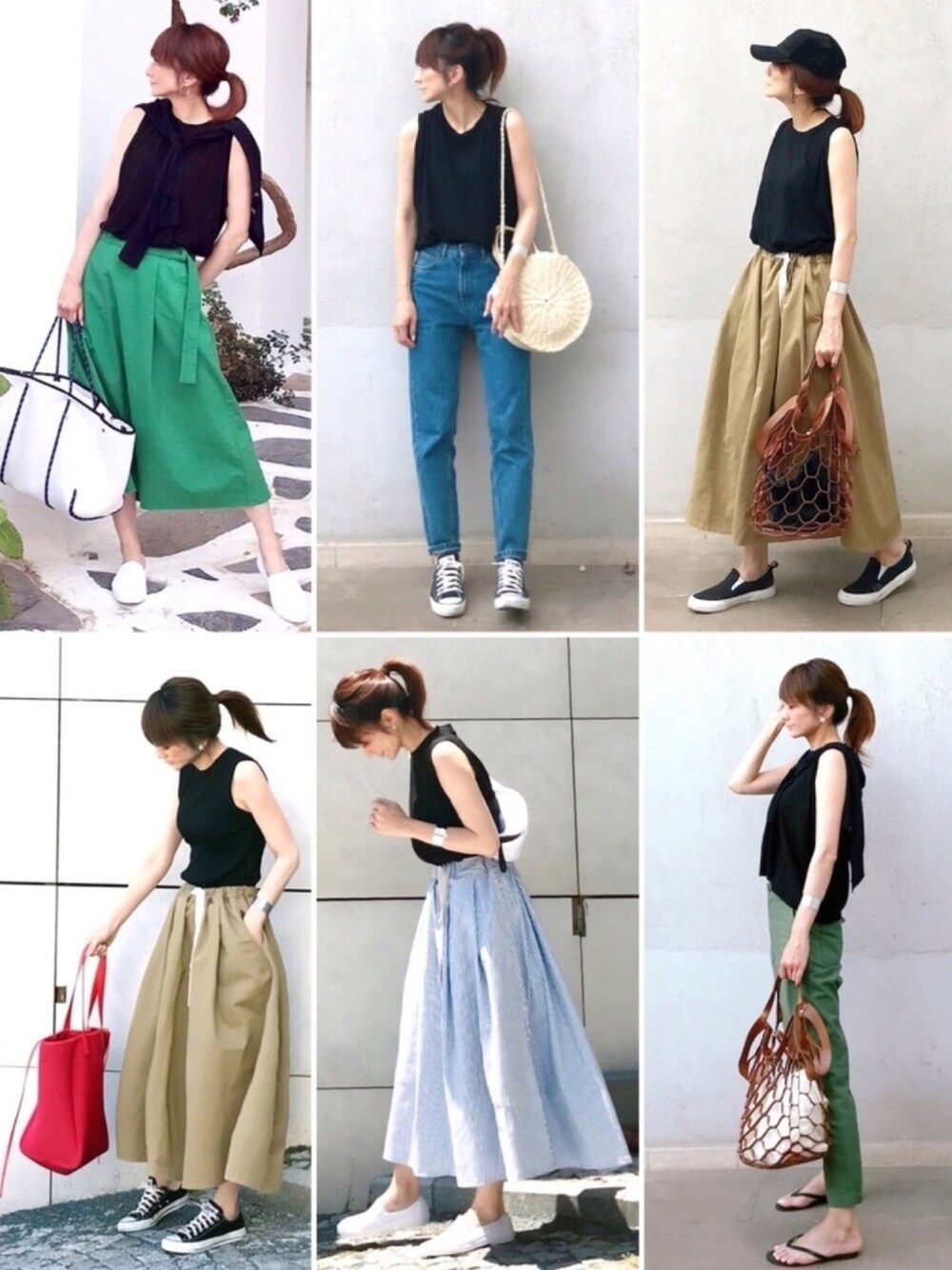 黒ノースリーブトップスコーデまとめ 黒ノースリーブって、スカートでもパンツでも、そしてどんな色のボトムスとも相性が良くて、まさに夏の万能選手ですよね😊💕💕 リブニットでフィット感があるタイプと、ゆるいシルエットのカットソータイプの二種類を私は着まわしてます🙋🏻♀️