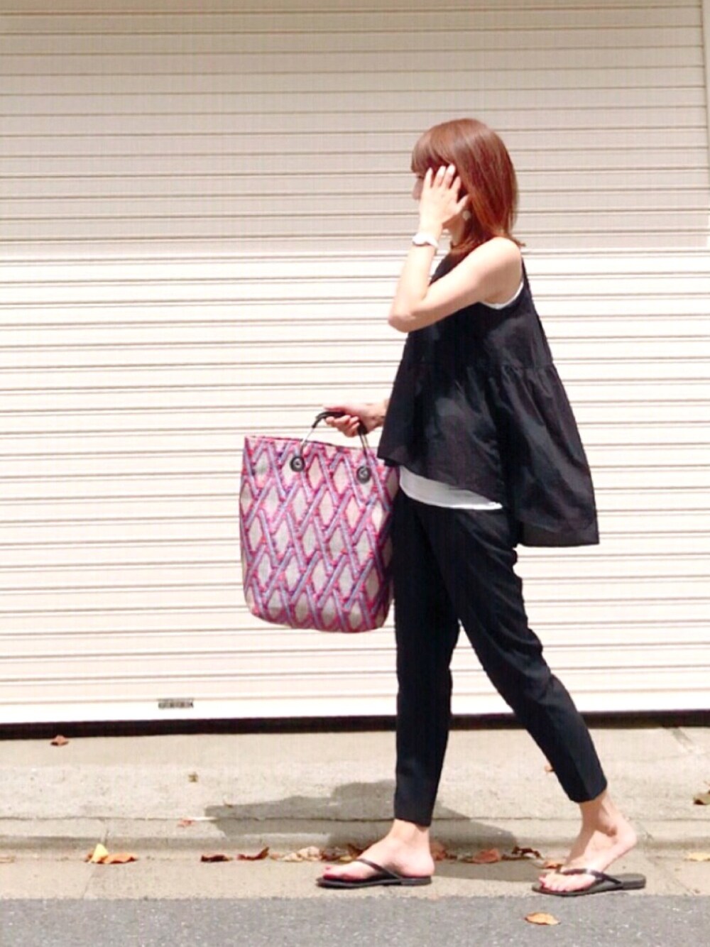大好きなオールブラック ところどころに白を覗かせて😊💕💕 パンツはセットアップのボトムスを着回してます🙆🏻♀️ 丈感もシルエットも絶妙で、生地もサラサラだから涼しく履けますよ‼️おすすめです