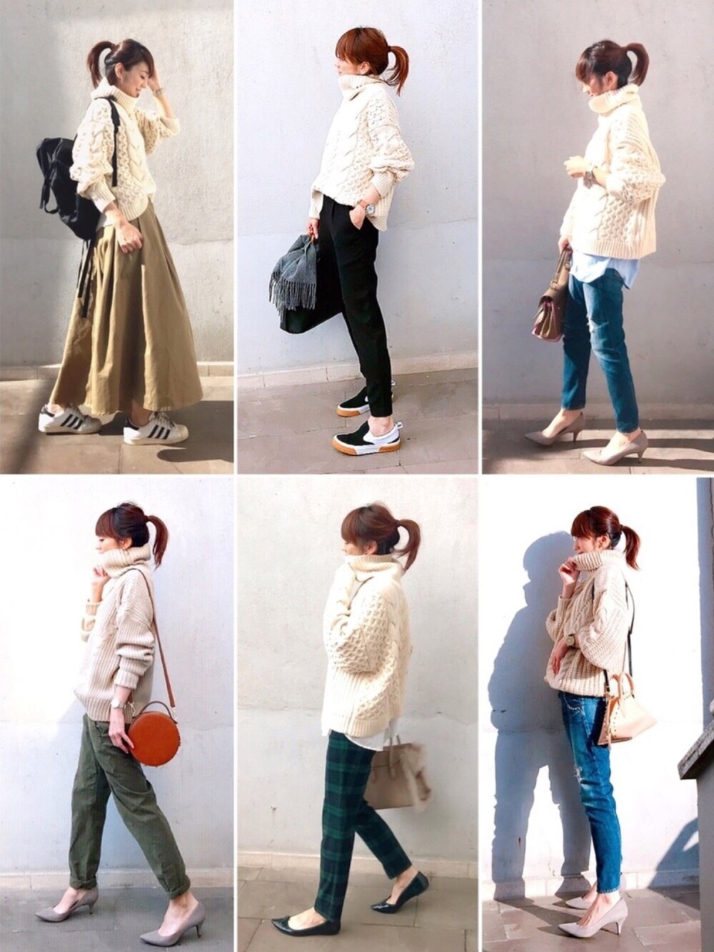 タートルネックニット大好き‼️ アウターがダークトーンになりがちな冬は、顔まわりが明るく見えるアイボリーやベージュのタートルが大活躍です🙆🏻♀️ 個人的には、顔を埋められるくらいのたっぷりタートルが好きです😆💕💕