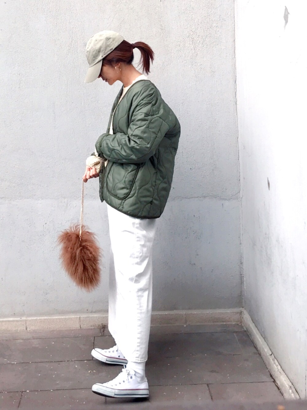 カーキ × 白 小物はベージュ系でまとめてアースカラー