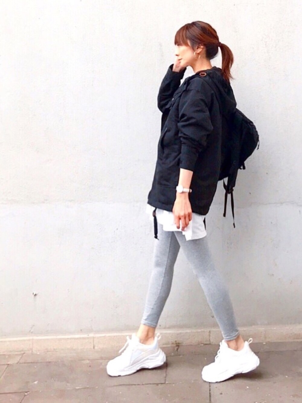 グレー × 黒 白多めで爽やかスポーティ🙋🏻♀️ ダッドスニーカーって初めて履いたけど、足元にボリュームが出るから脚が細く見える錯覚😂💕💕
