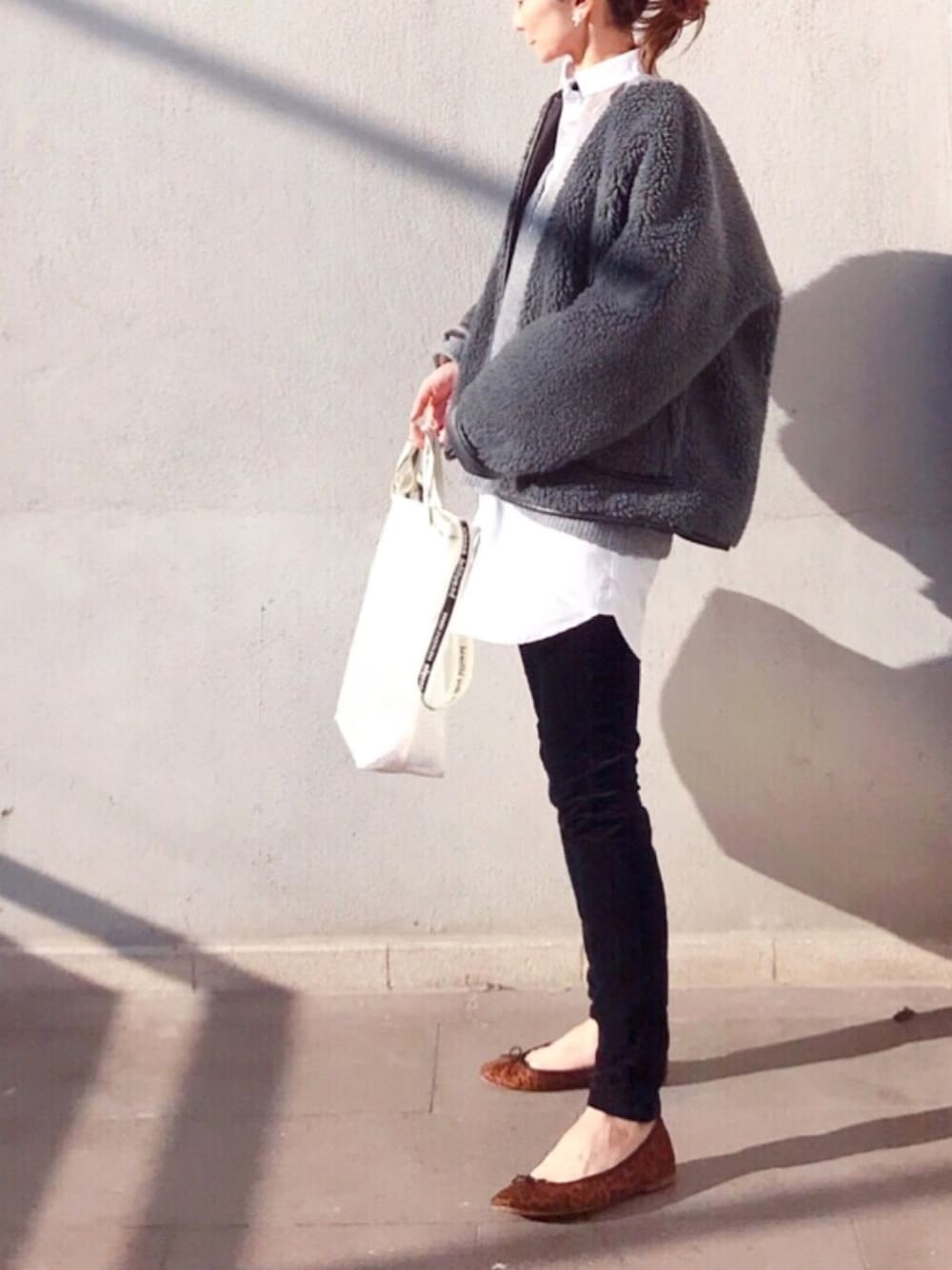 todayful ボアブルゾンに長めのシャツをレイヤードしてます💕💕 足元のレオパードバレエシューズがポイントです🙆🏻♀️ 履きやすくておススメです🥺