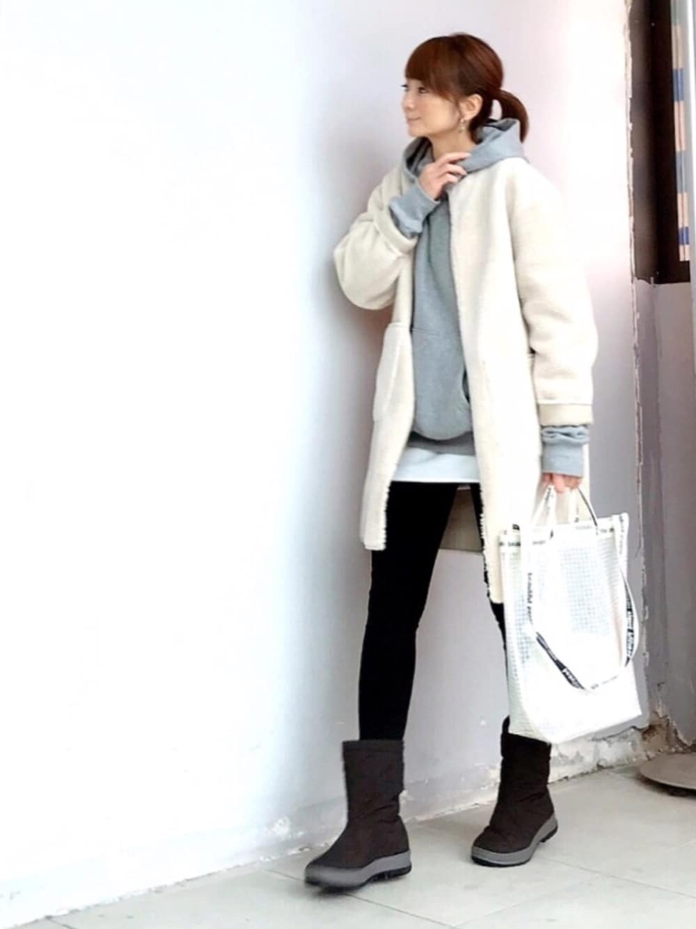 白ボアコートは、大人のスポーツミックスコーデを程良く上品に仕上げてくれます🥺