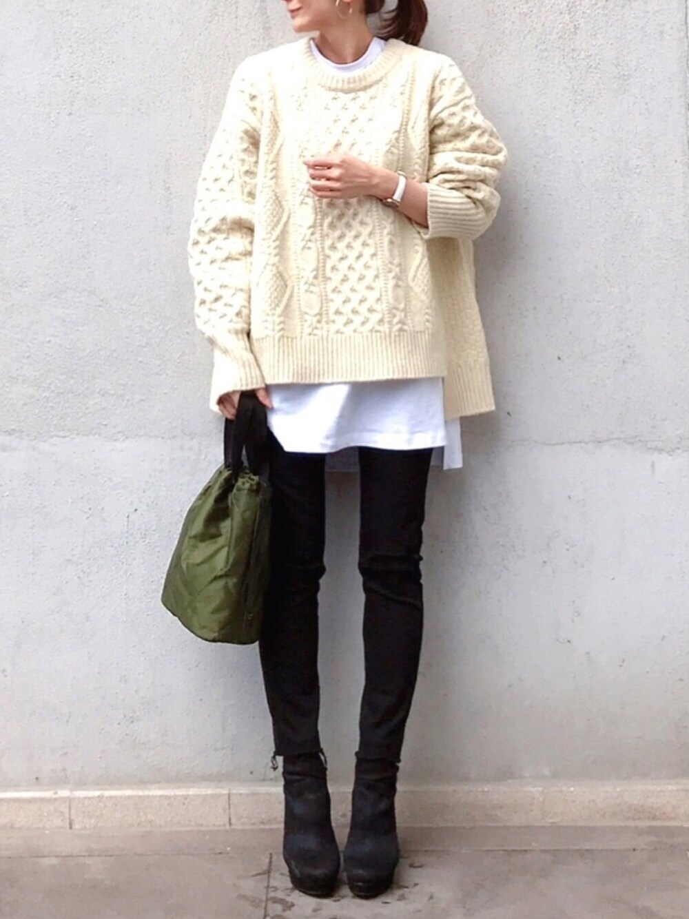 黒スキニー × ケーブルニット 間に挟んだTシャツが、ゆるニットに清涼感を足してくれます🥺💕💕 カーキのキルティングバッグは、何にでも似合って重宝してます🙆🏻♀️