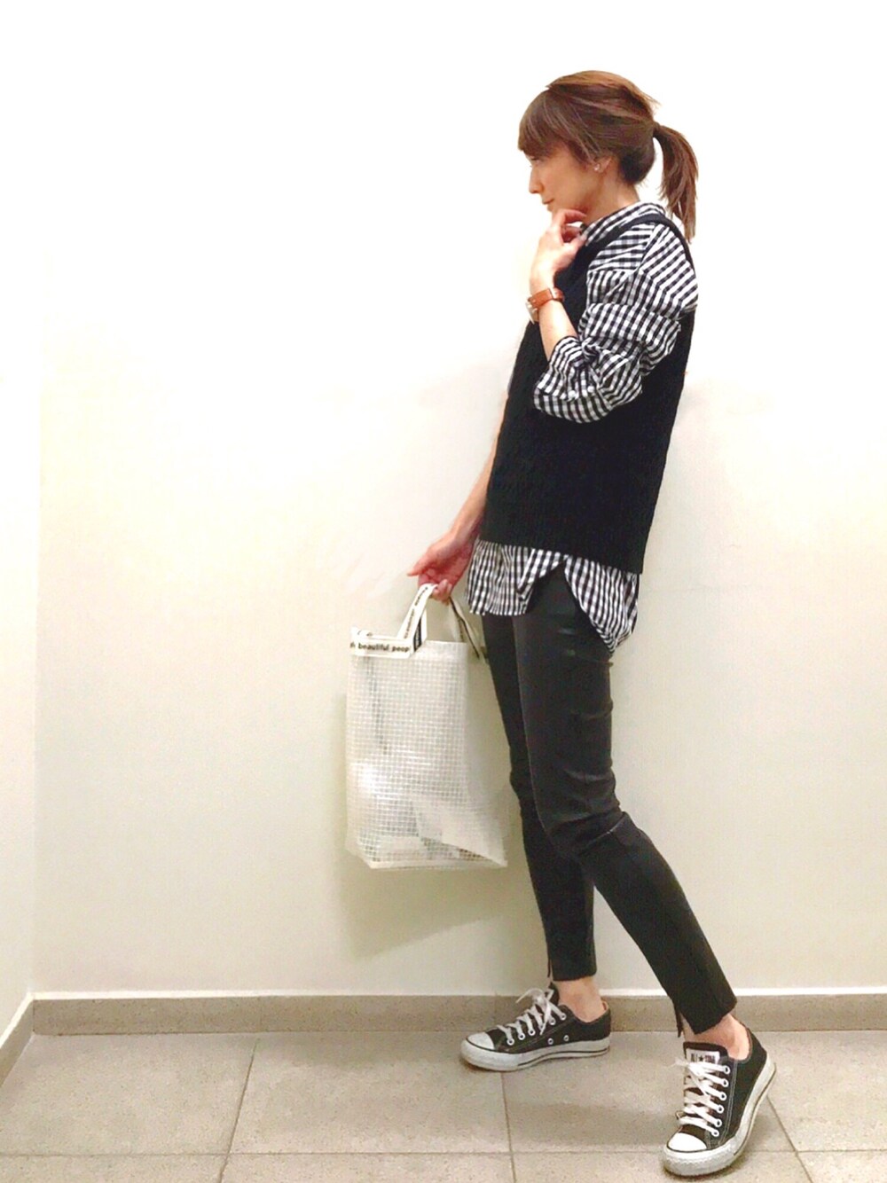 ギンガムチェック × レザーレギンス ボトムのレザーがちょっぴりハードでも、ブラウスがギンガムチェックなら、程よく可愛い感じになります🥺💕💕 この春気になってるベストをレイヤード🙆🏻♀️ パールボタンが美しいemmataylor のギンガムチェックブラウス。本日なら2000円オフクーポンが出ていますので、とってもお得です‼️ 是非覗いてみてください🙌🏻