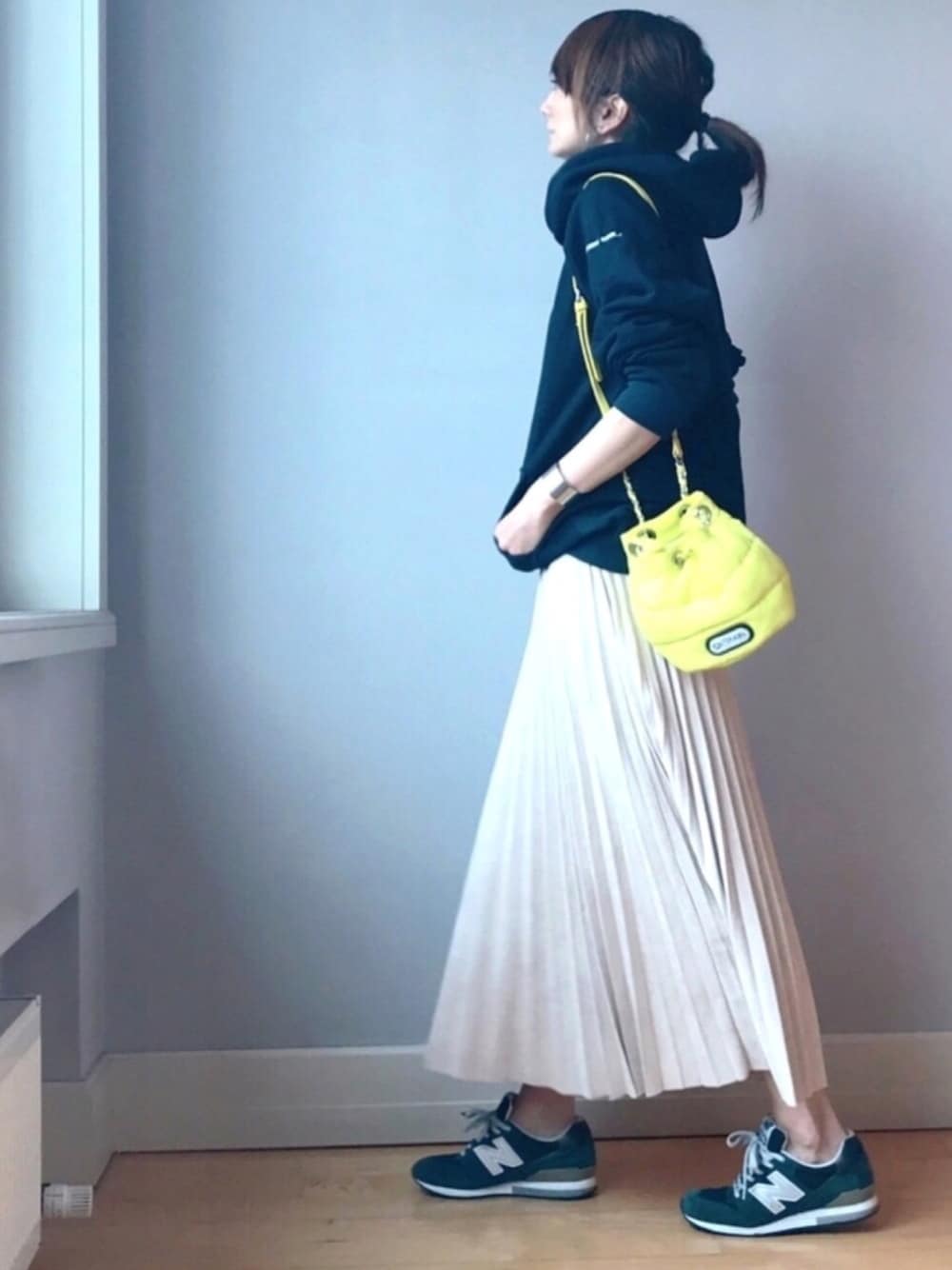 プリーツスカート × パーカー 黄色ポシェット投入で春意識🌸🌸🌸 corners プリーツスカート、本日1000円オフクーポン出ています🙆🏻♀️‼️お見逃しなく!